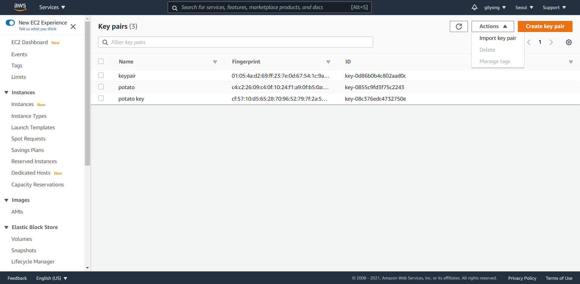 3. 다시 Key Pairs 항목으로 돌아와 'Import Key pair' 클릭해 Putty로 만든 Key pair를 임포트 해주자!