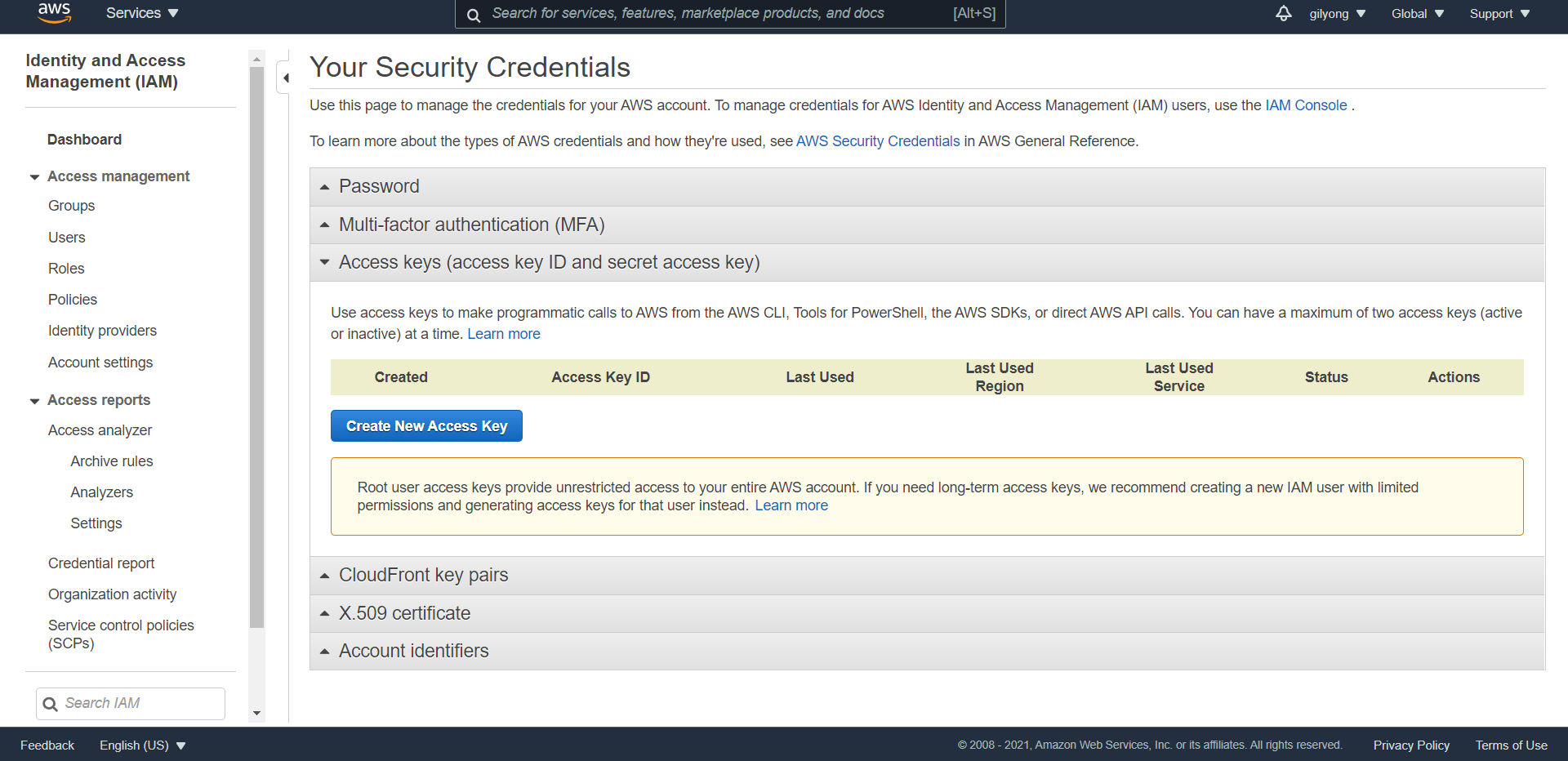 Access Key와 Secret Key를 생성하는 방법에 대해서 알아보도록 하자