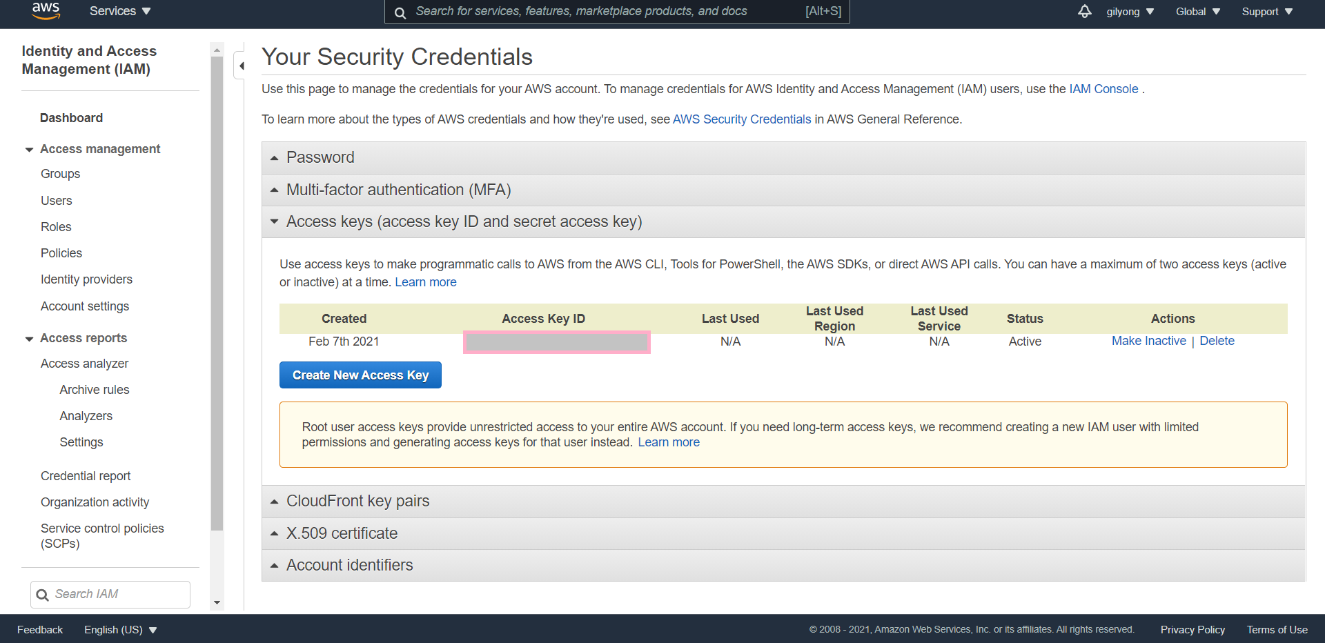 4. Access Key가 생성된 것을 확인할 수 가 있다.
