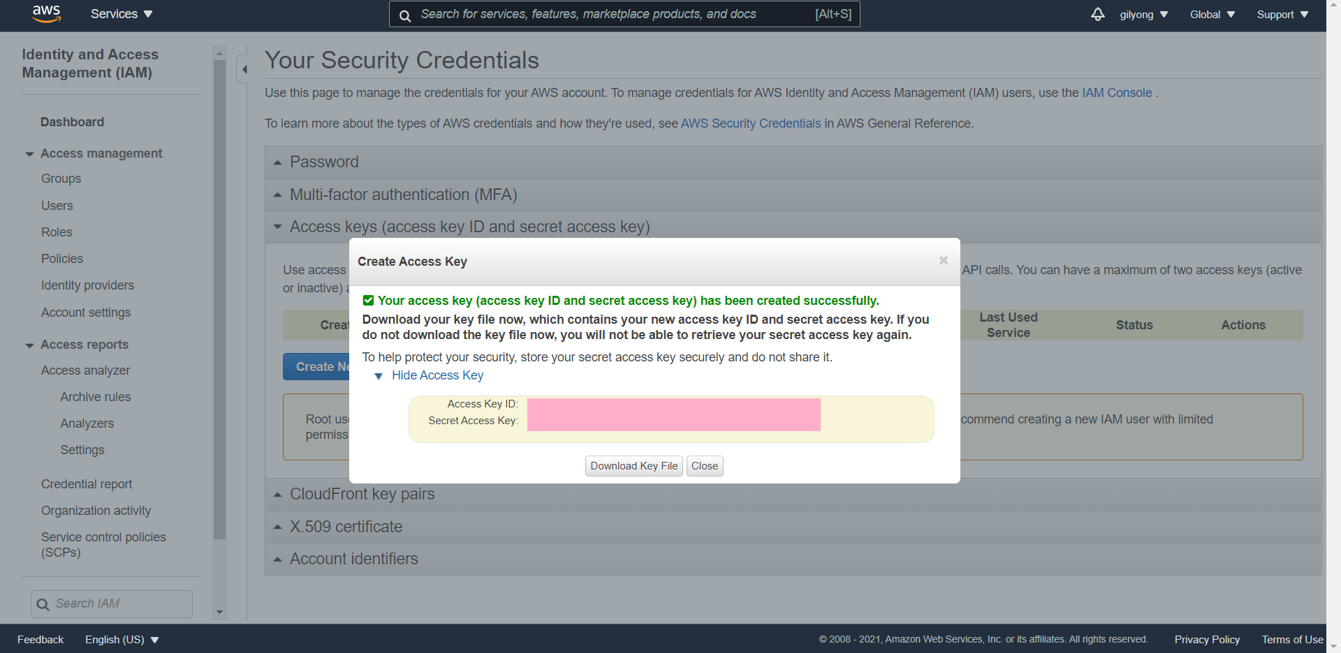 3. Access Key와 Secret Key를 생성하였다. 이 Key들은 파일로 다운로드할 수도 있다.