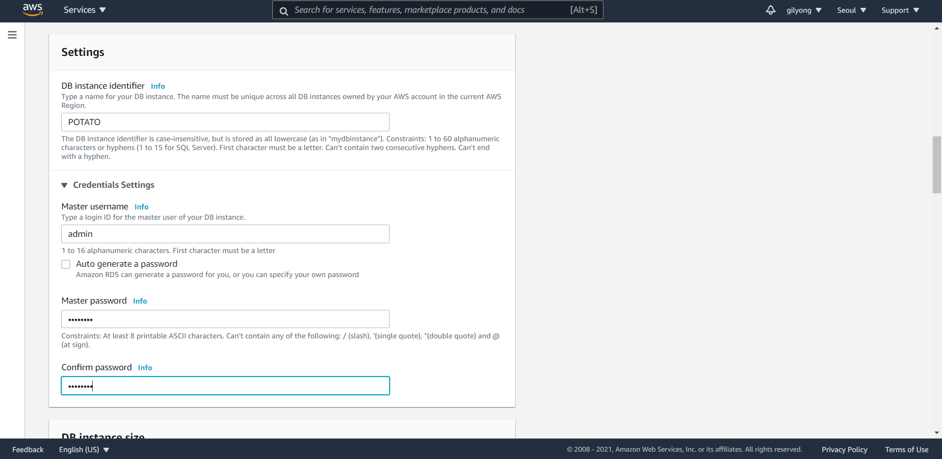 7. 다른 설정들은 기본값으로 해준뒤 potato라는 이름의 DB 인스턴스를 생성해주었다.
