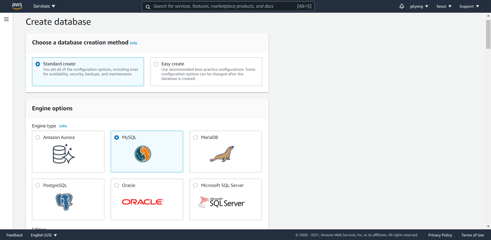 2. 직접 세부 설정해 줄 것이기 때문에 Standard Create 체크하고, DB 엔진으로는 사용하기 쉬운 MySQL를 선택해주자