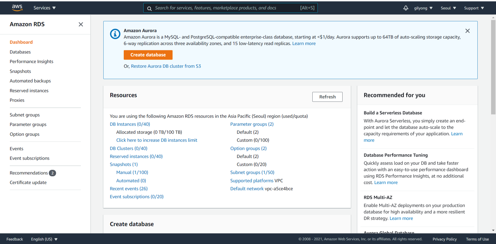 1. AWS Console에서 RDS로 들어와서, 'Create database'를 눌러 DB 인스턴스를 생성해주자.