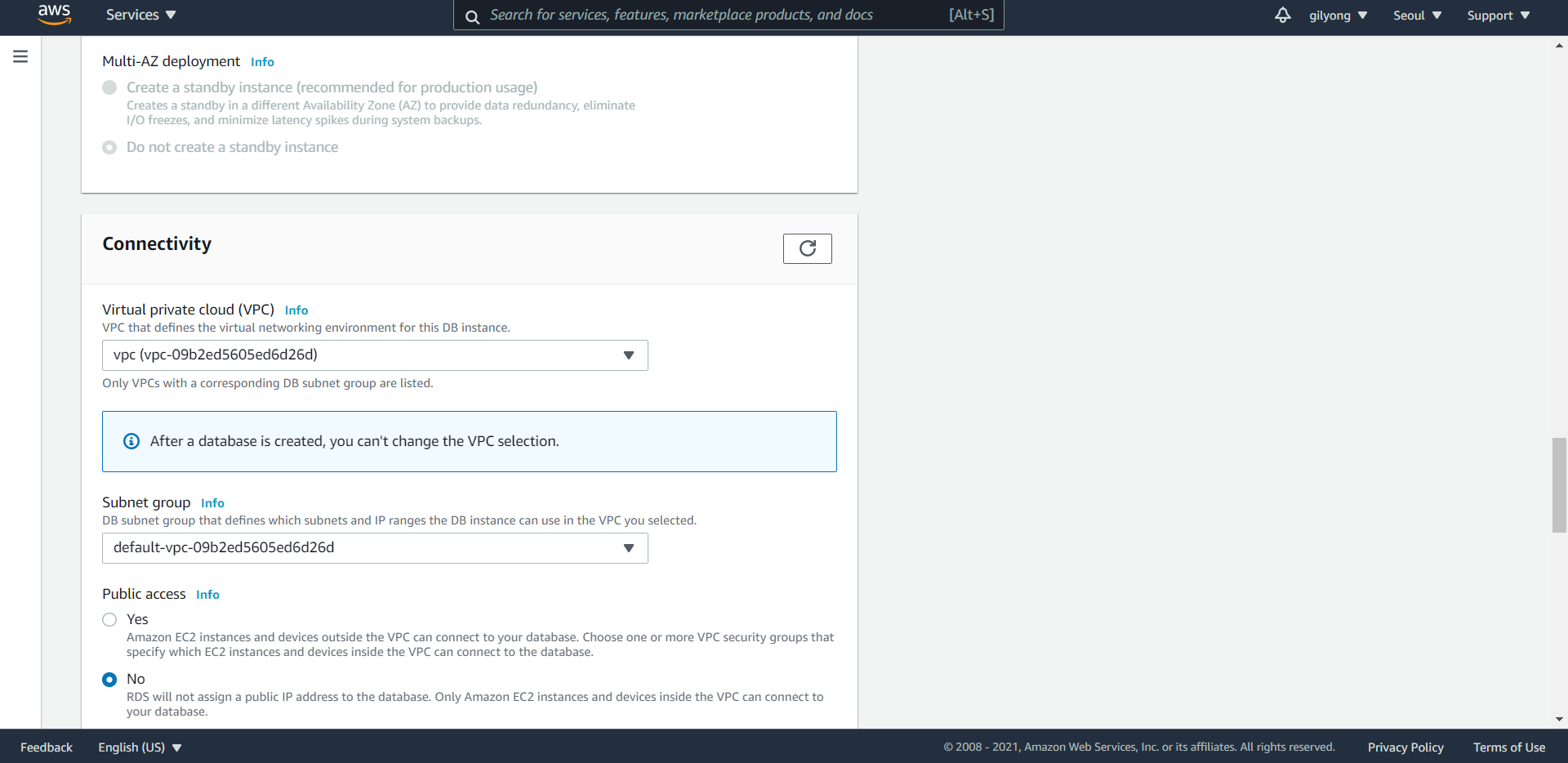 5. DB 인스턴스에 사용할 VPC와 서브넷 그룹을 선택해주자.