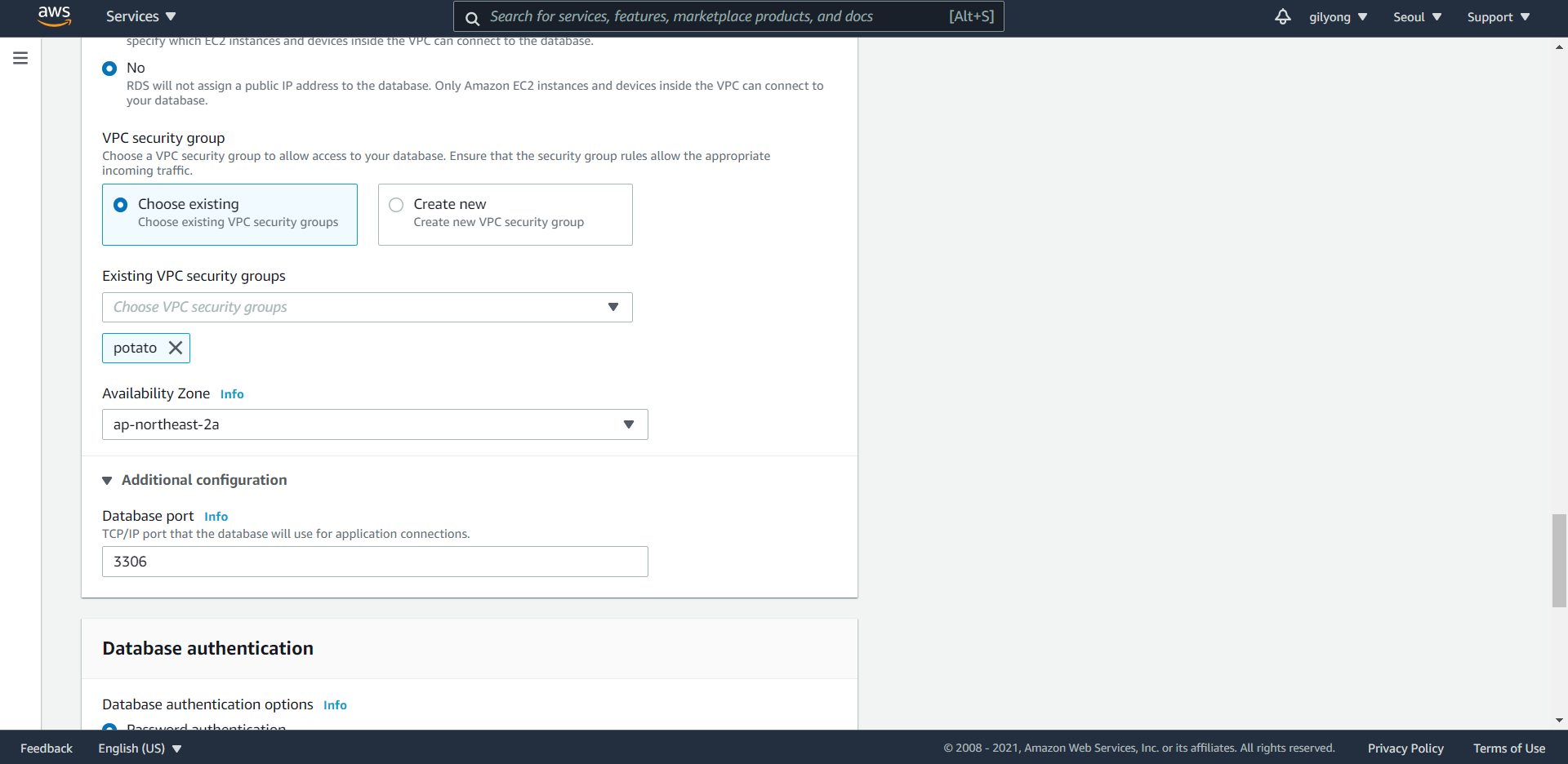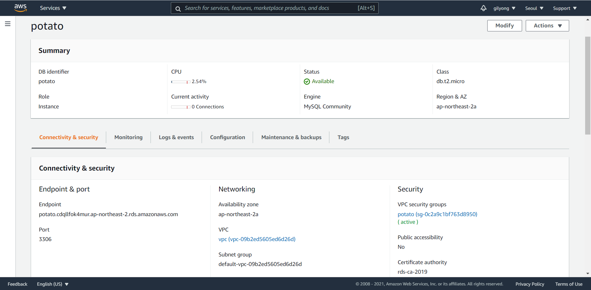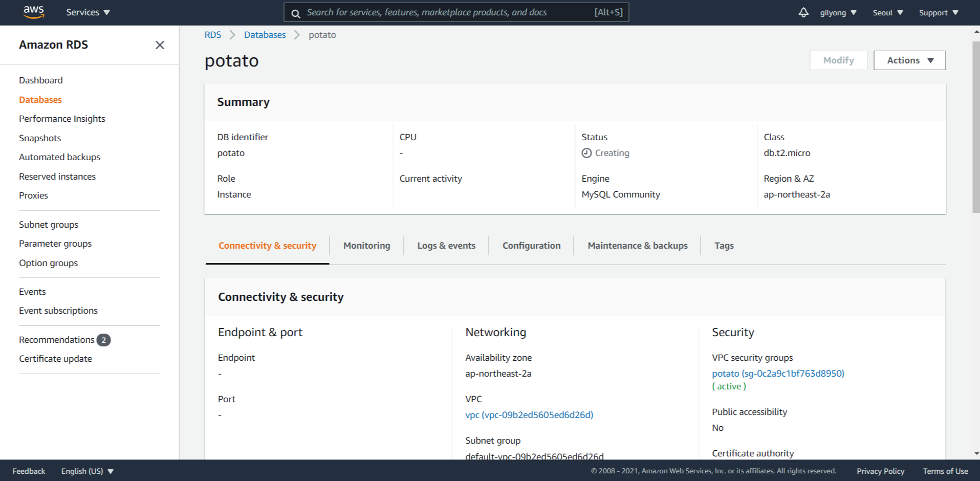 7. 다른 설정들은 기본값으로 해준뒤 potato라는 이름의 DB 인스턴스를 생성해주었다.