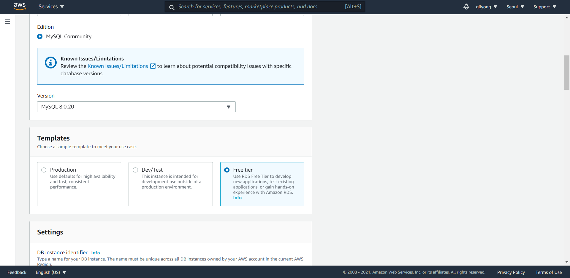 3. MySQL의 버젼은 8.0.20 으로 선택해주었다. DB 인스턴스는 프리티어로 만들어 주도록 하자