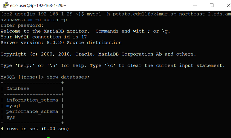 10. 생성했던 DB 인스턴스의 Endpoint 주소와 패스워드로 EC2에서 접속해 보았다.