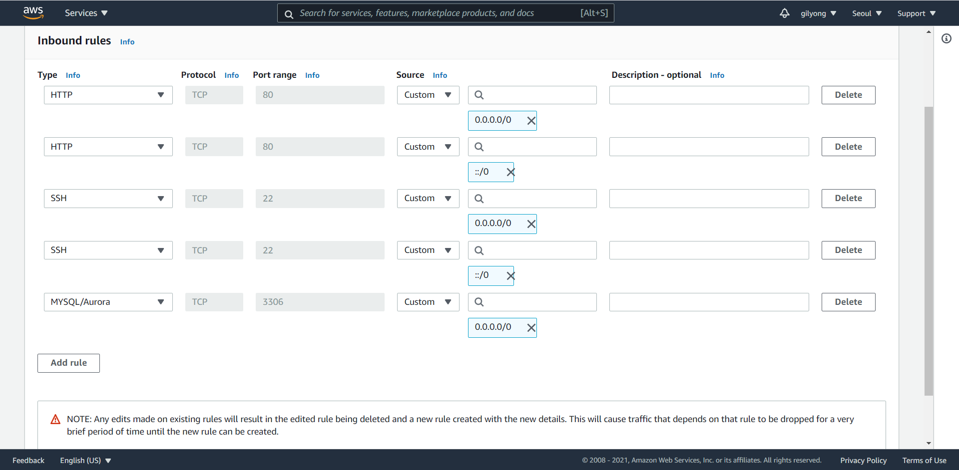 9. Security Group - 인바운드 규칙에서 MySQL의 포트를 허용해주자.