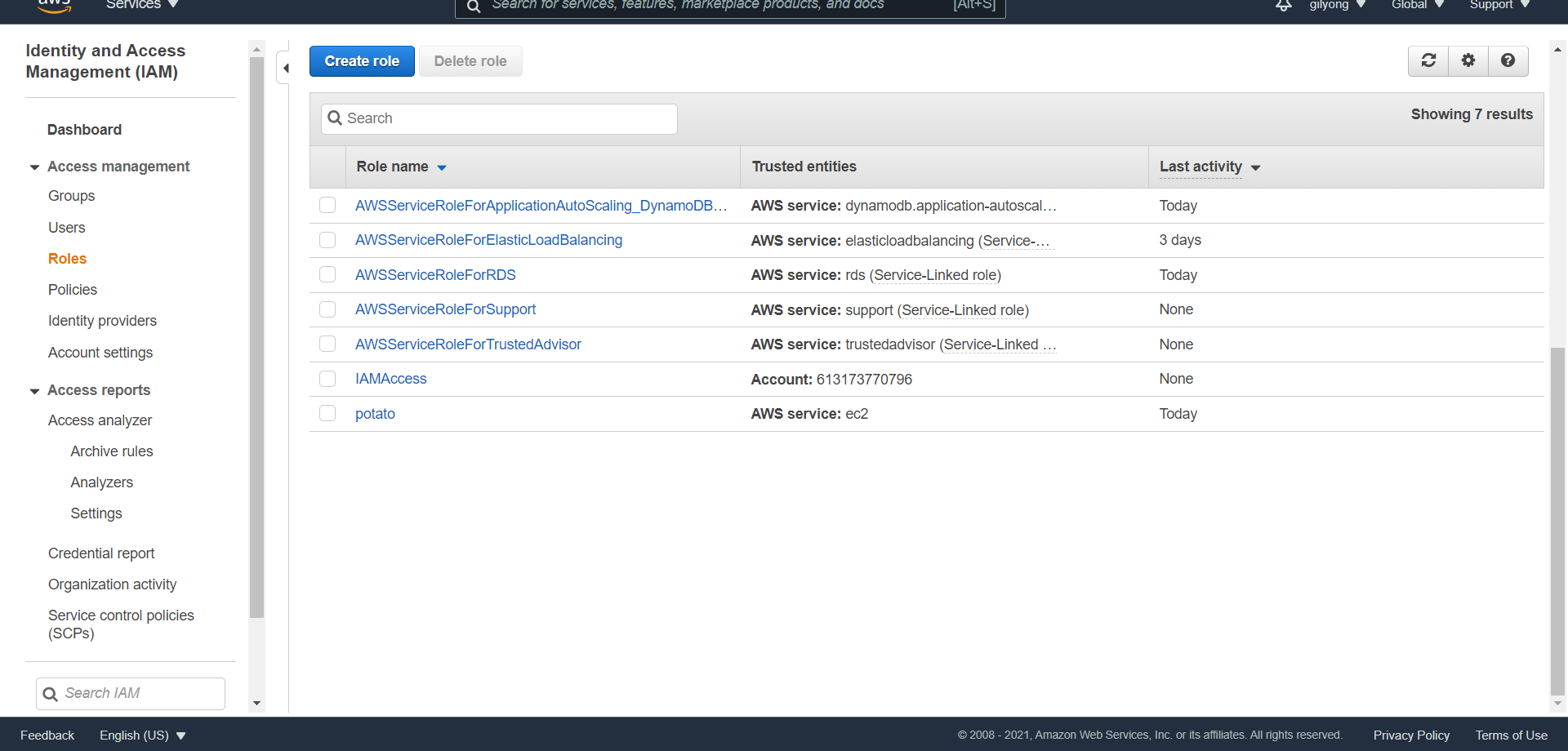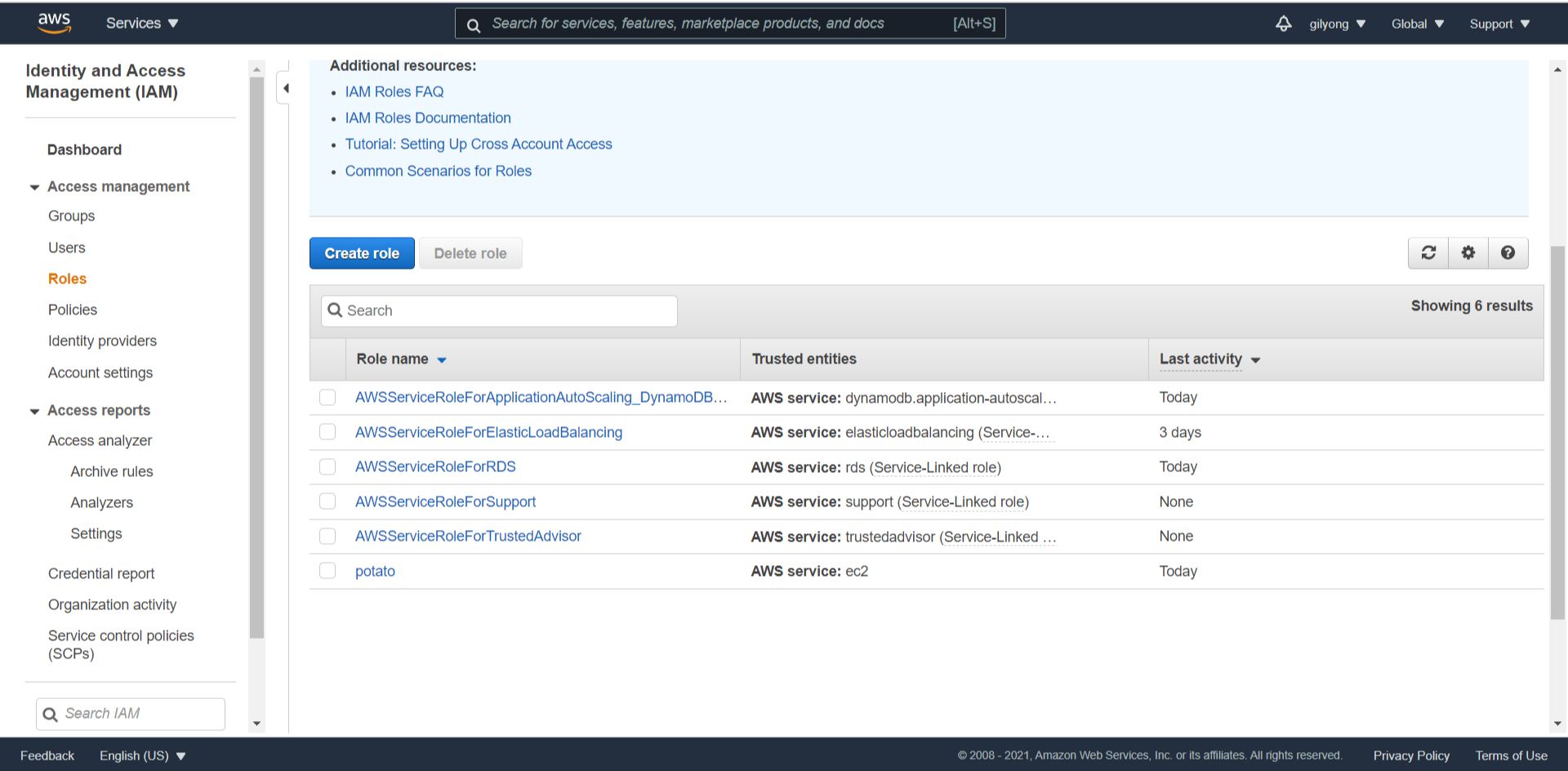1. IAM > Roles 항목에서 'Create role' 을 클릭해 역할을 생성해주자.