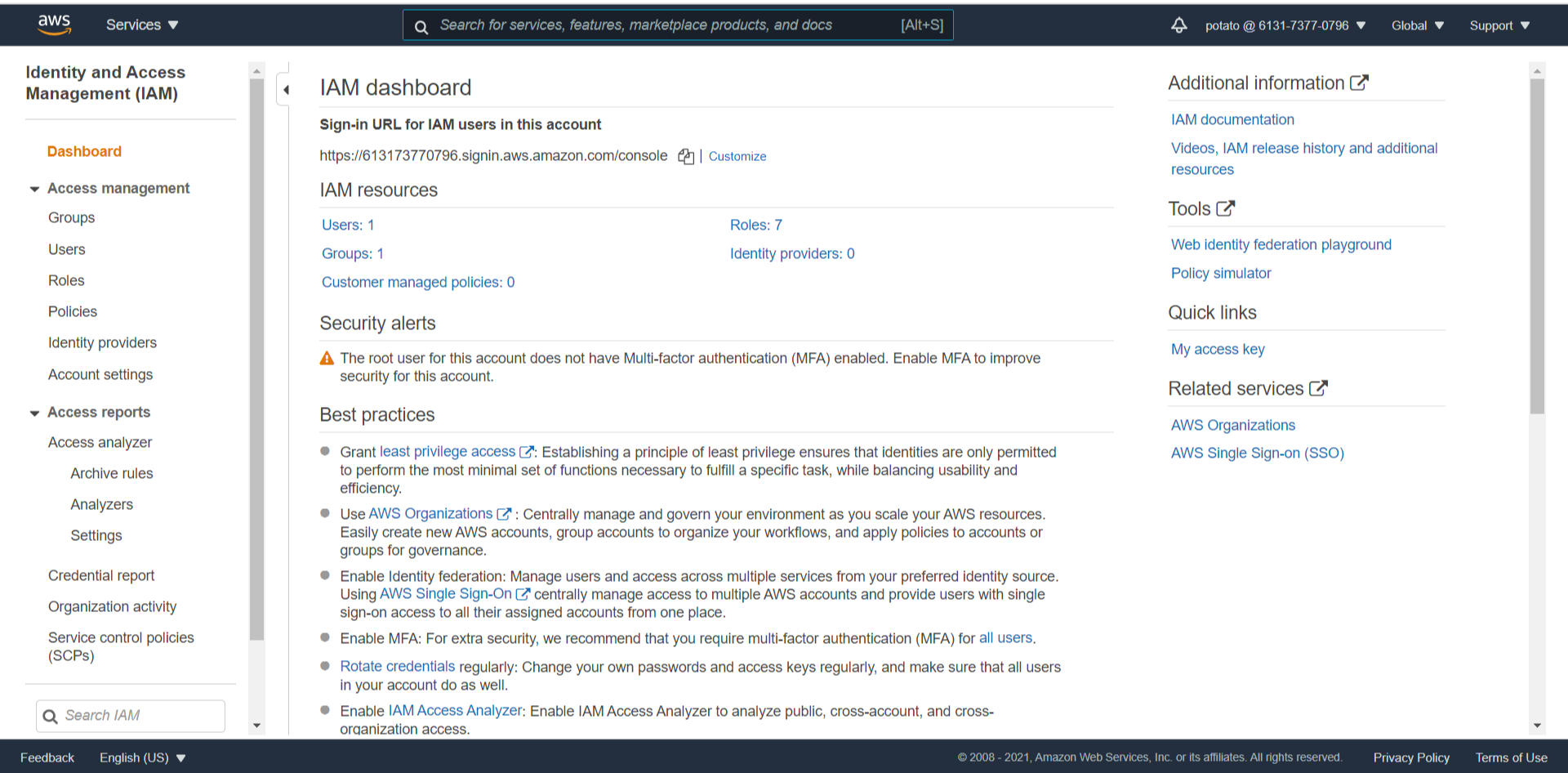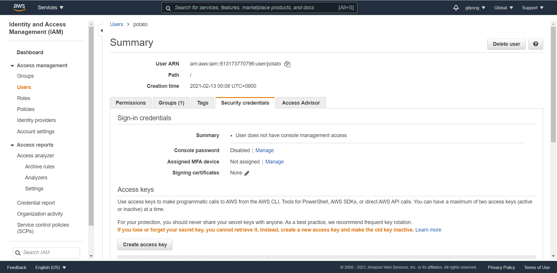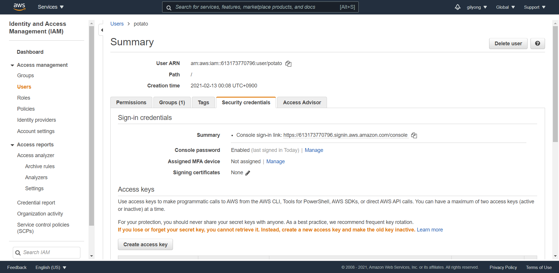 5. 이제 다시 potato 계정으로 로그인해보면 아까는 없었던 IAM에 대한 권한이 생긴 것을 확인할 수 있다.