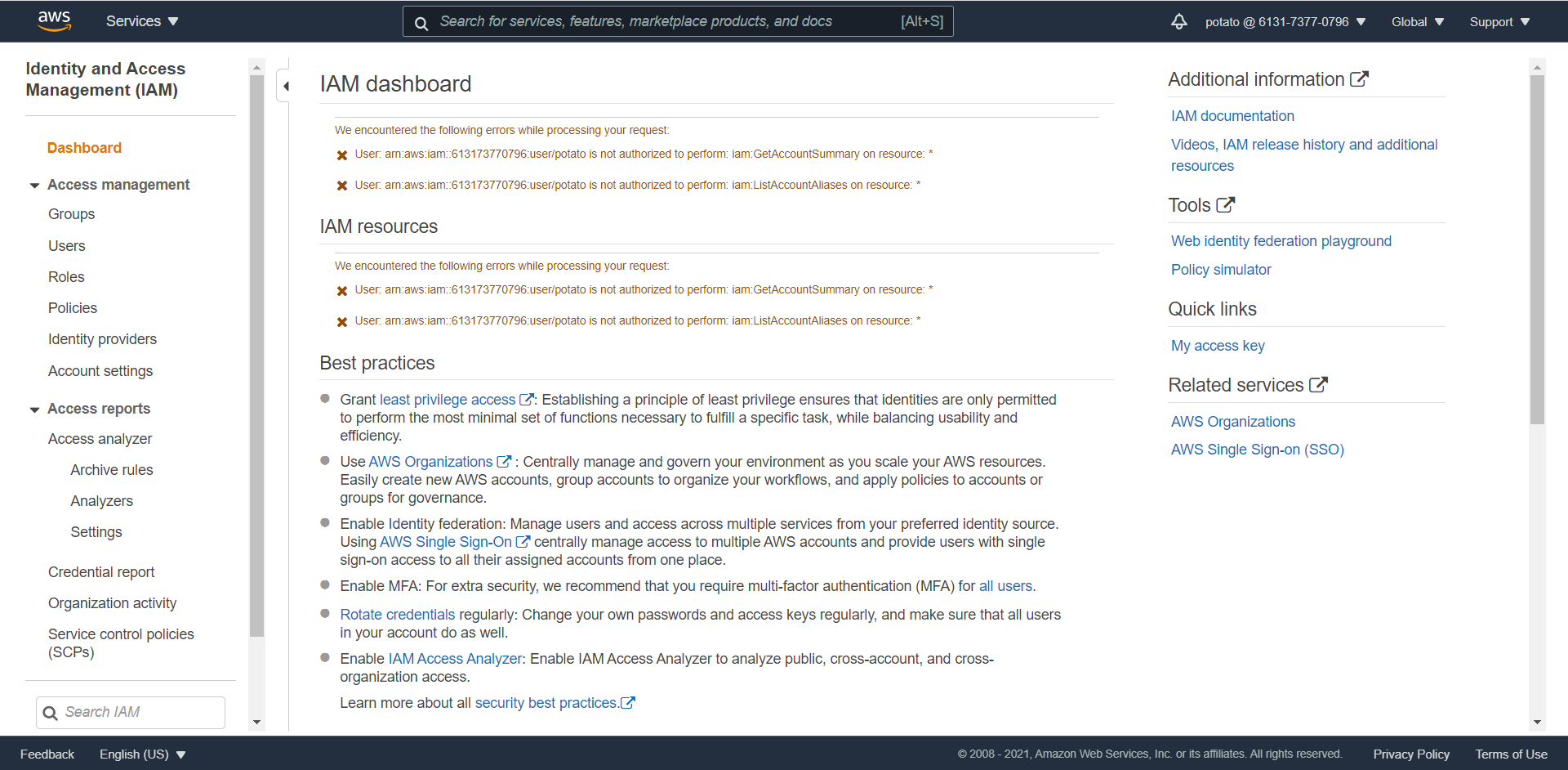 5. 오른쪽 상단을 보면 potato 사용자로 로그인된 것을 확인할 수 있고, IAM을 수정에 대한 정책이 없다는 메시지도 확인할 수 있다.
