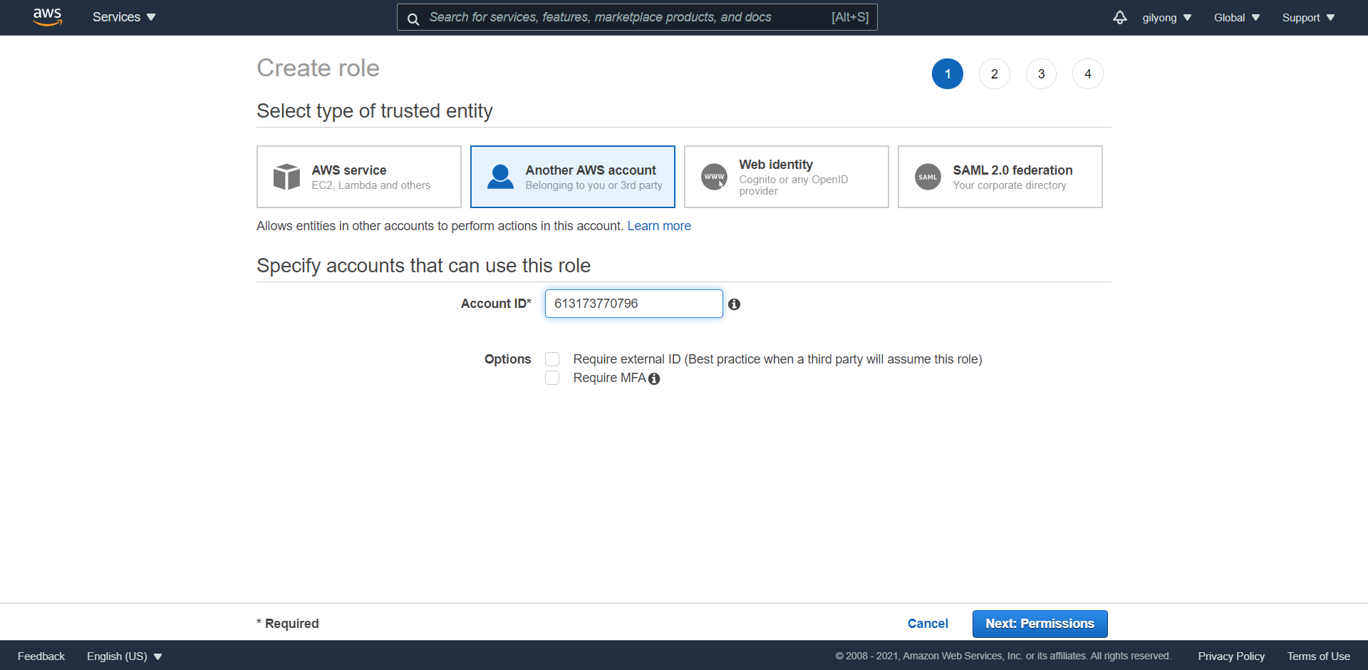 2. Another AWS account를 누르고 역할을 부여할 계정의 ID를 넣어주자.