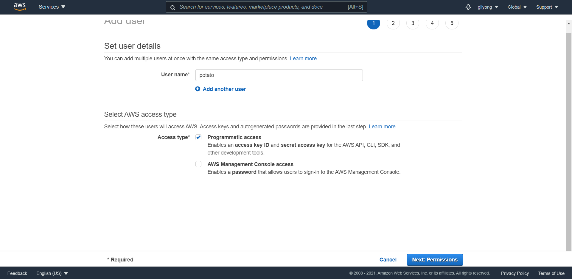 2. 사용자의 이름은 potato로 지어주고 접근방식은 액세스키와 시크릿키를 이용하는 Programmatic access로 선택하자.