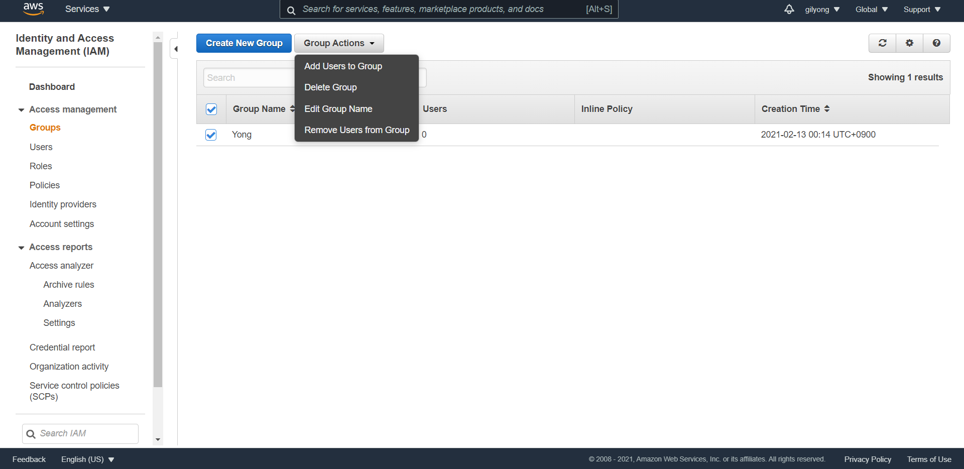 4. 생성된 그룹에 사용자를 추가하기 위해서는 Group Actions > Add User to Group 눌러주자
