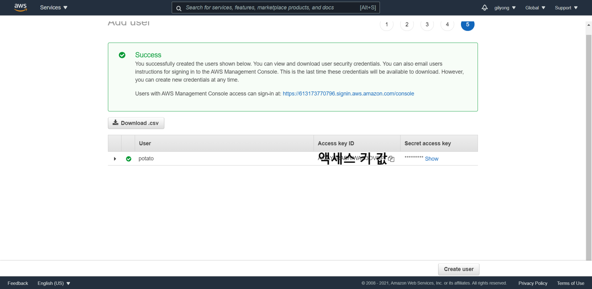 3. 생성된 Access Key값과 Secret Key 값은 잃어버리지 말고 잘 보관해두자. 여기서 보관을 안하면 다시는 찾을 수 없게 된다.