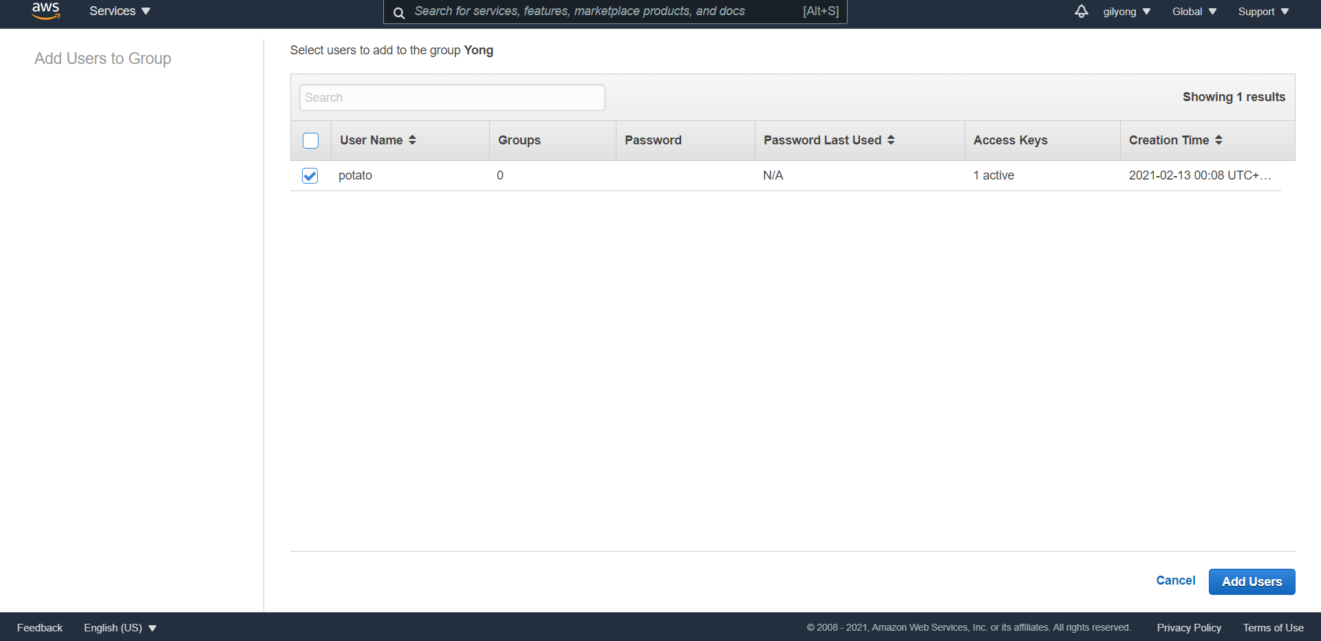 5. 추가할 사용자를 선택해주면 potato 사용자가 Yong 그룹에 추가된다