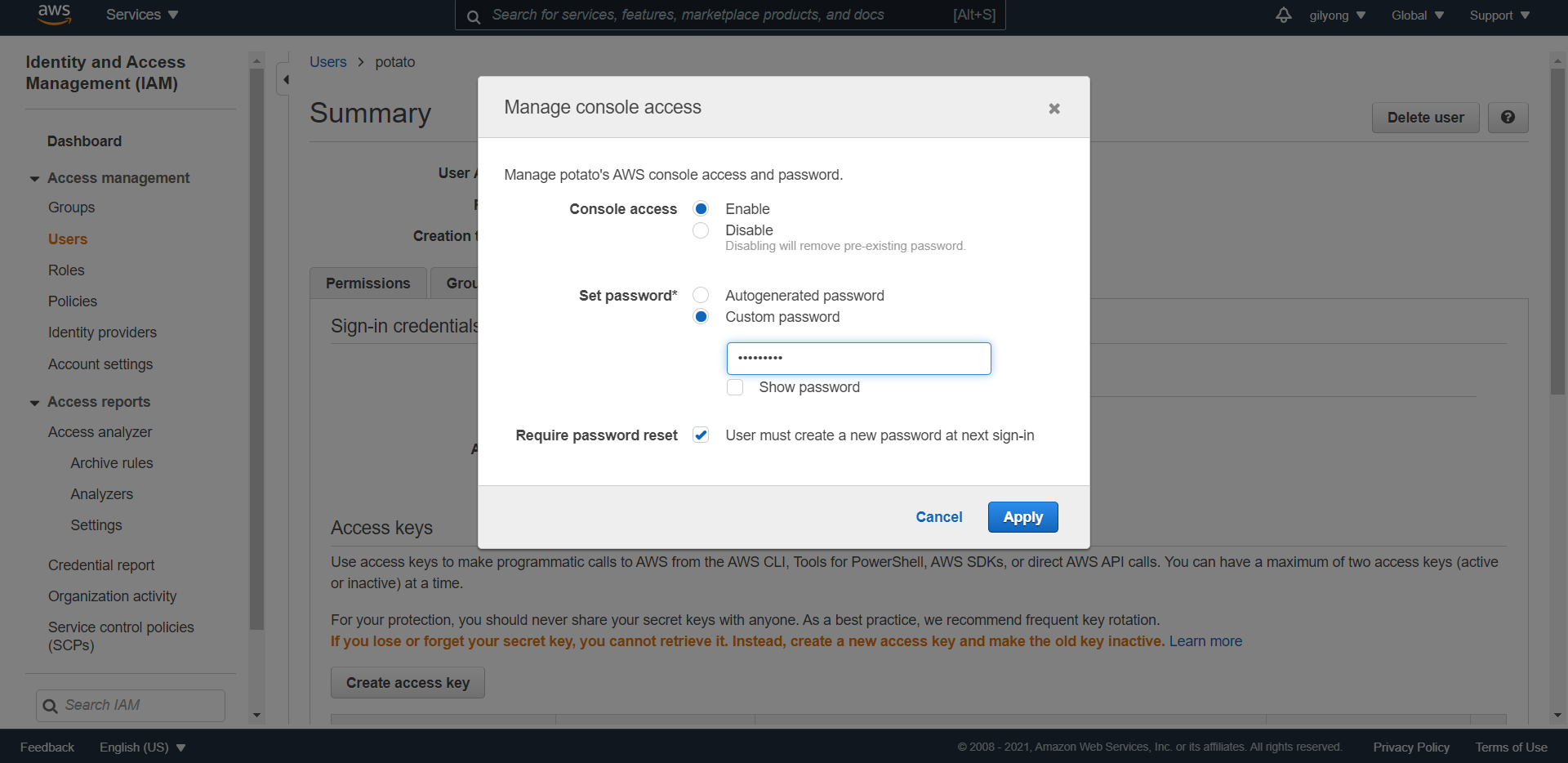 1. 접속할 유저의 계정으로 들어가 Security credentials > Console password > Manage 눌러주자