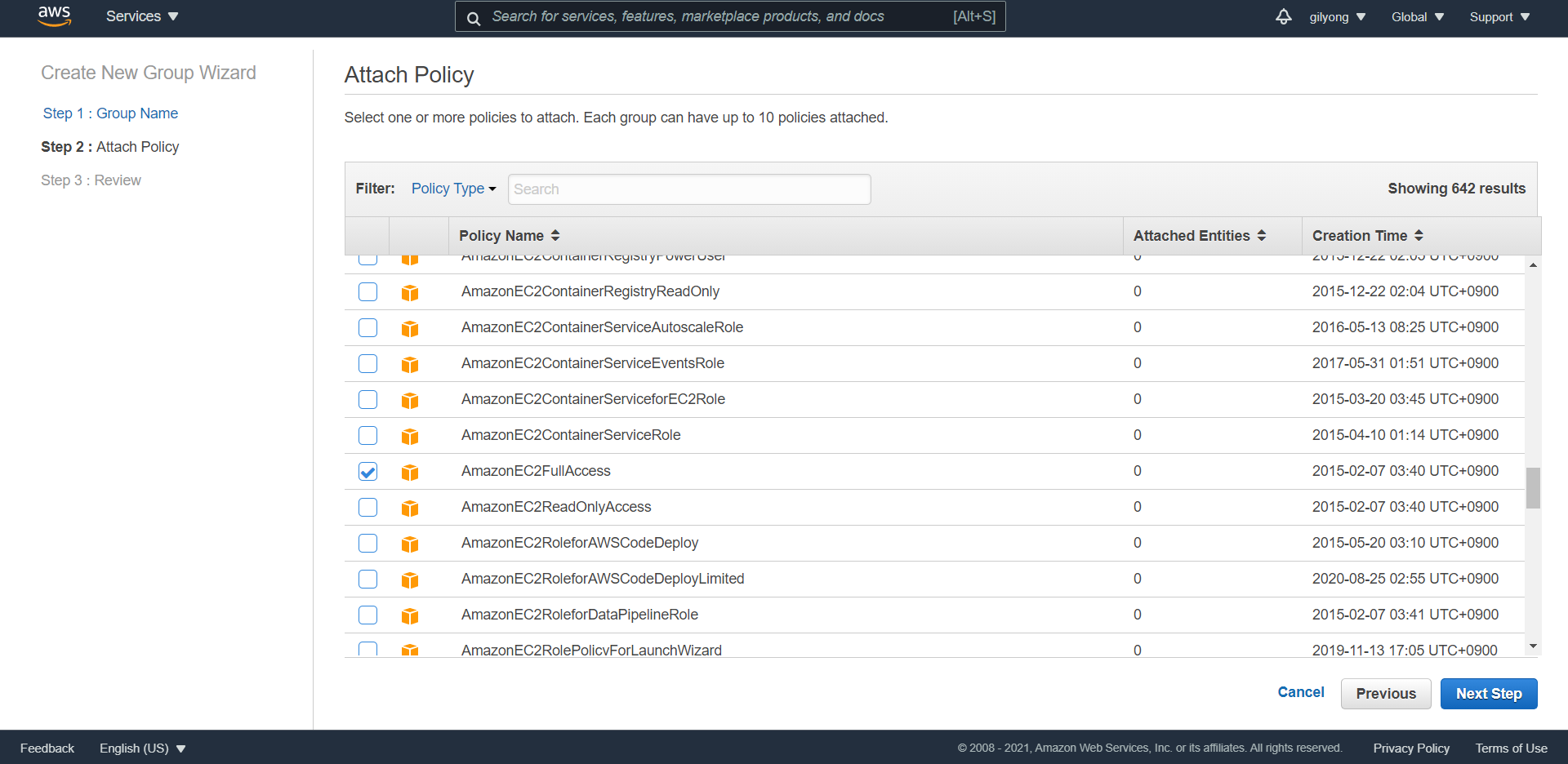 3. 그룹에게 EC2 인스턴스만 제어할 수 있도록 정책을 설정해주었다.