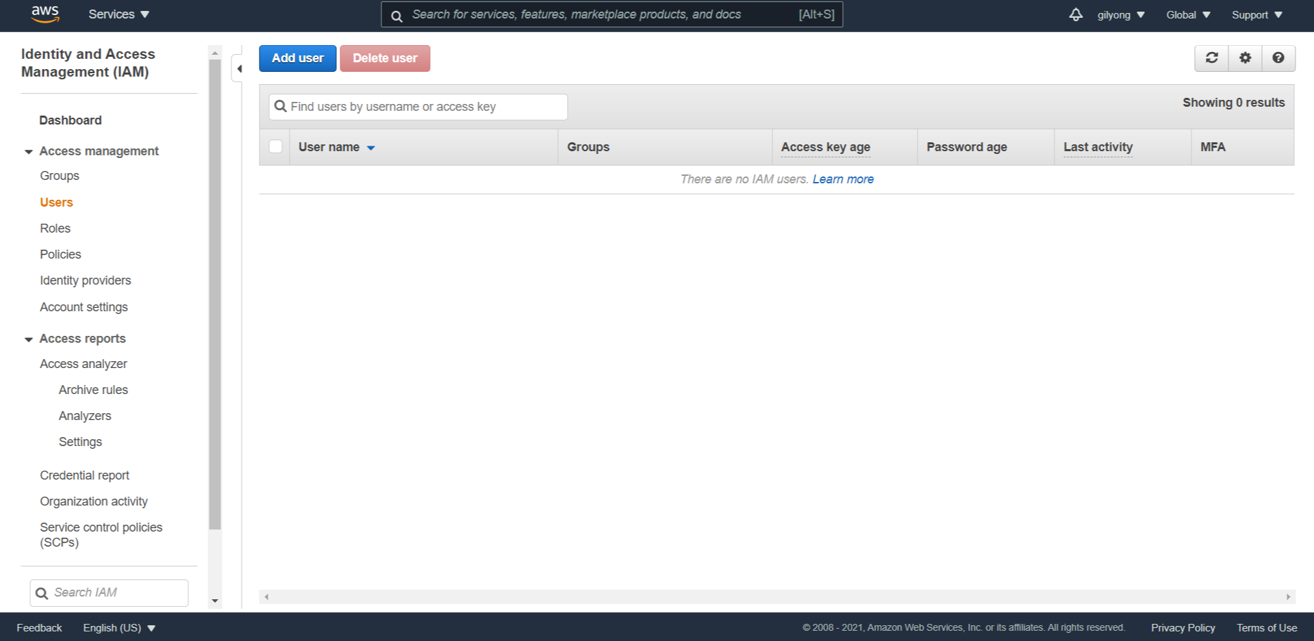 1. AWS console에서 IAM에 접속해 'Add User'를 클릭해서 사용자를 생성해주자.