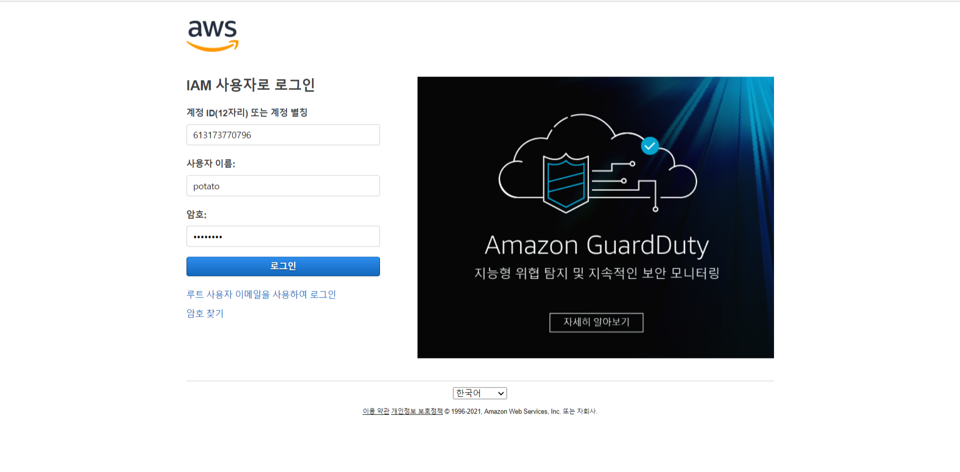 생성했던 IAM 사용자 계정으로 AWS 콘솔에 접속해보자!!