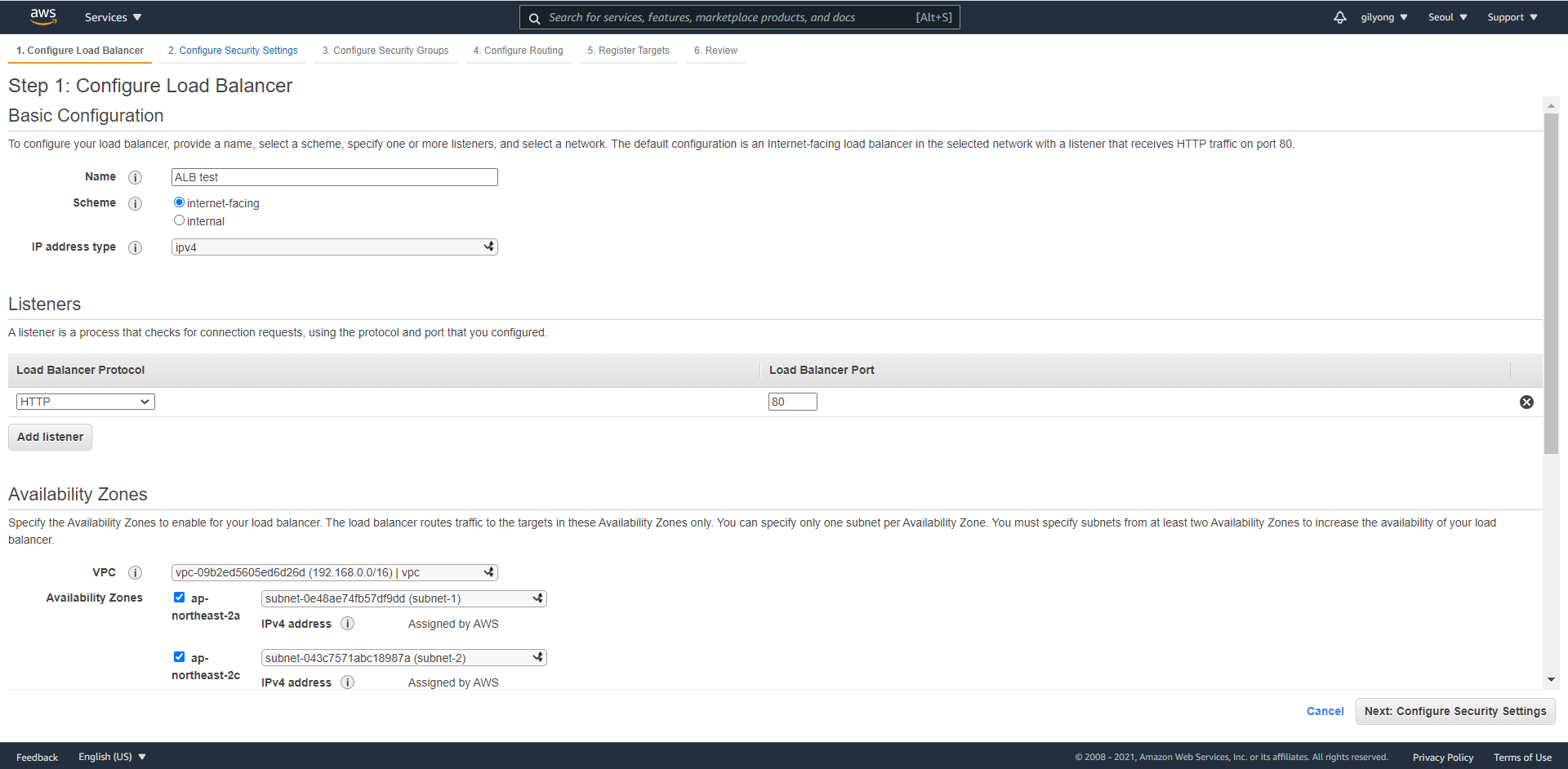 3. 로드밸런서의 이름을 정해주고, 사용할 vpc의 서브넷을 선택해준다.