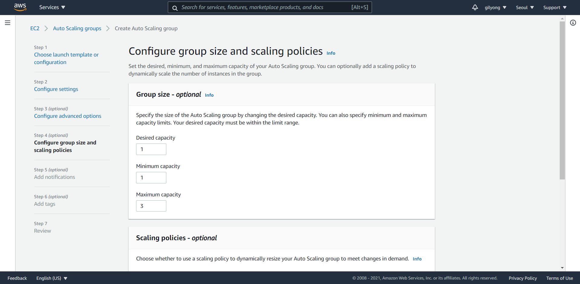 7. 그룹의 사이즈를 설정하는 과정이다. 최소 1개부터 최대 3개까지 늘릴 수 있게 해주었다.