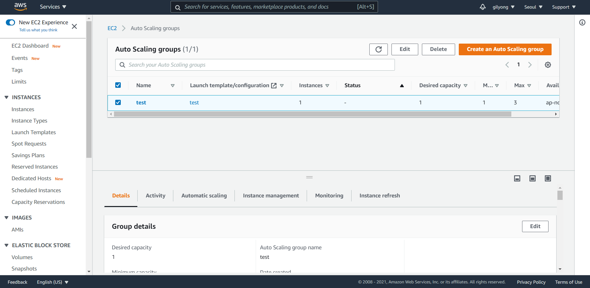 8. test 라는 이름의 Auto Scaling groups 이 생성되었다.