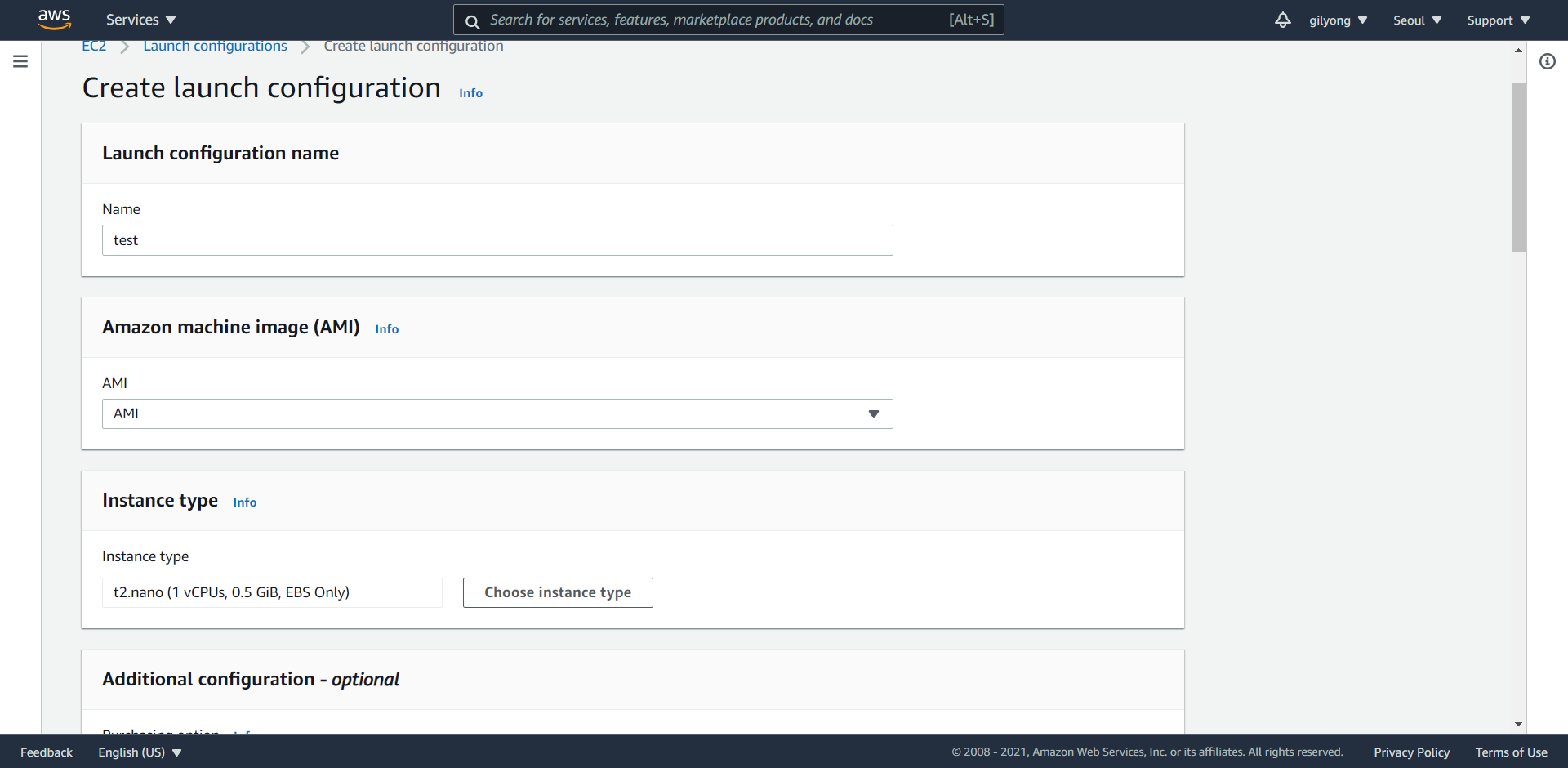 2. 시작 구성의 이름, 사용할 AMI 이미지 , 생성할 인스턴스의 유형 설정.