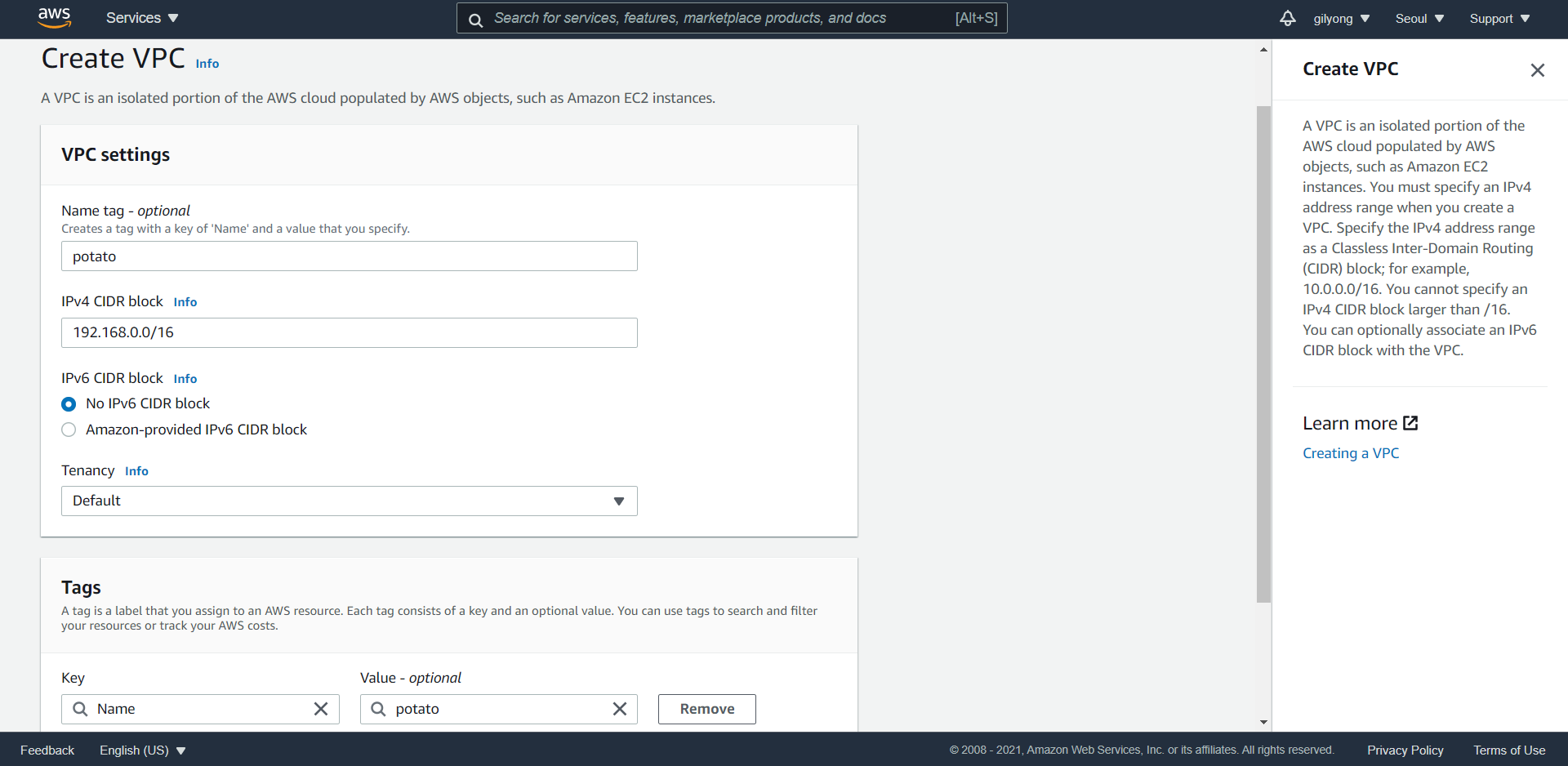 2. VPC의 이름과 CIDR 대역을 정해주자.