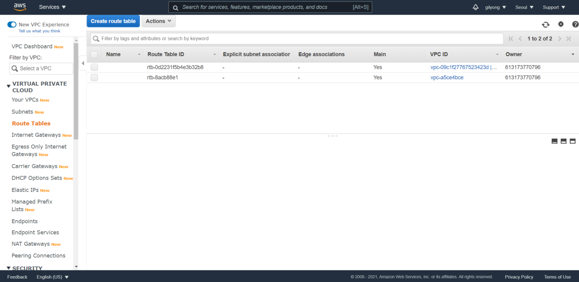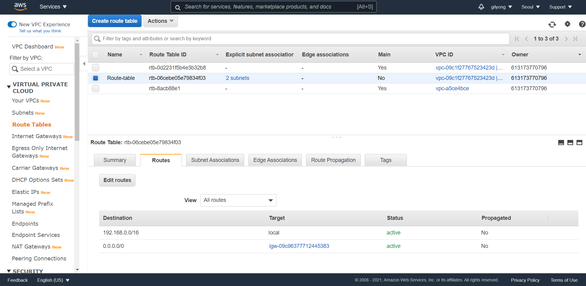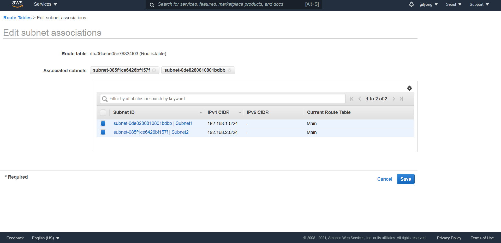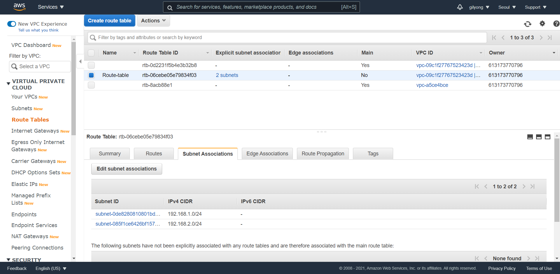 5. 라우팅 테이블에 2개의 서브넷이 연결된 것을 확인할 수 있다.