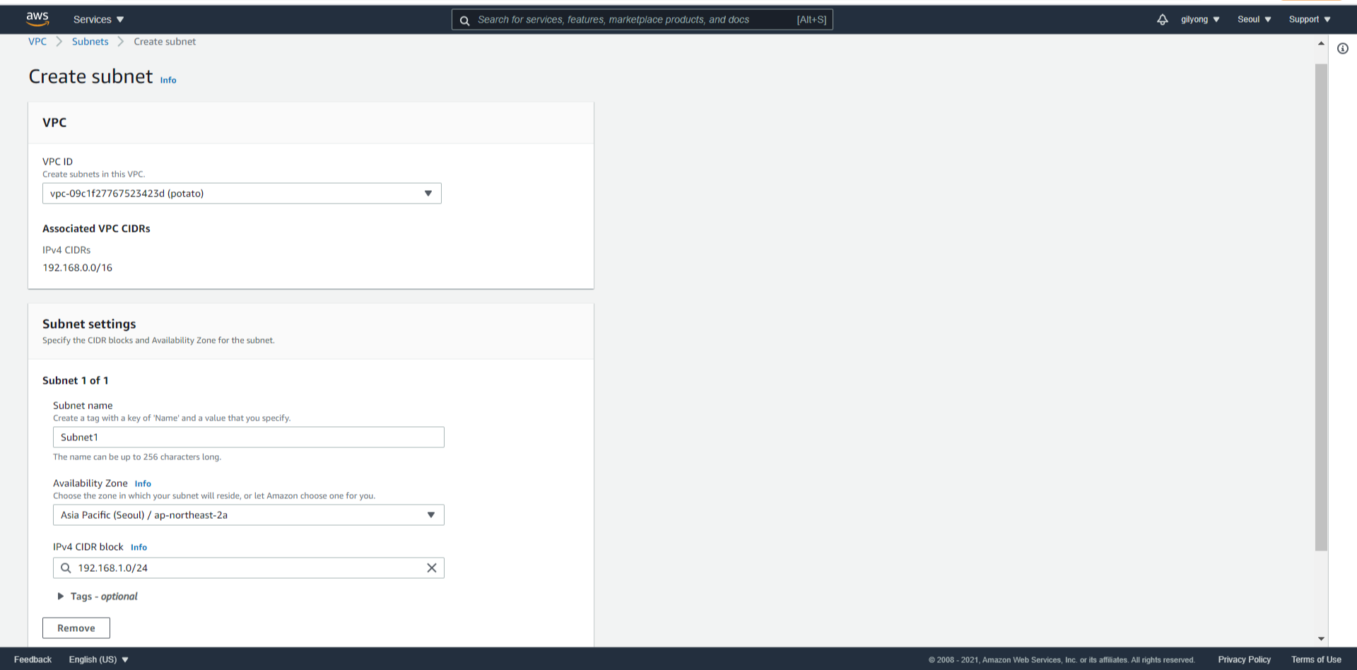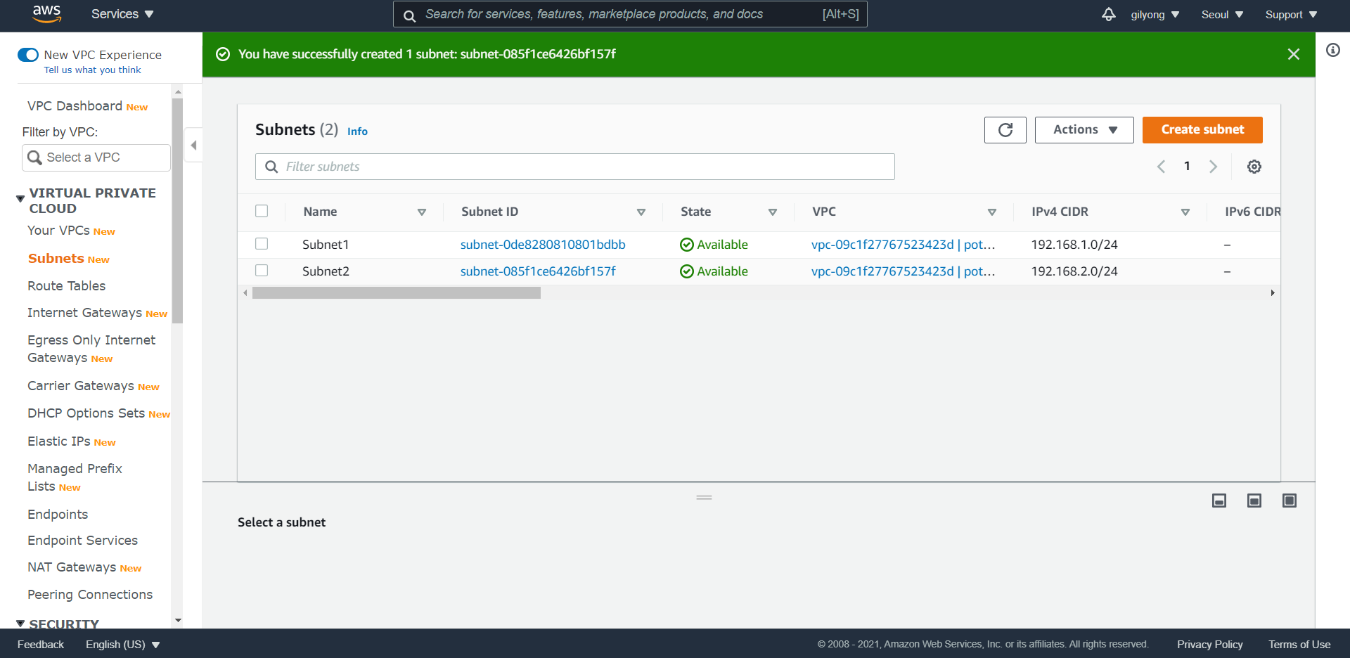 가용 영역이 ap-northeast-2c이고 CIDR이 192.168.2.0/24인 Subnet2 도 같이 생성해주었다.