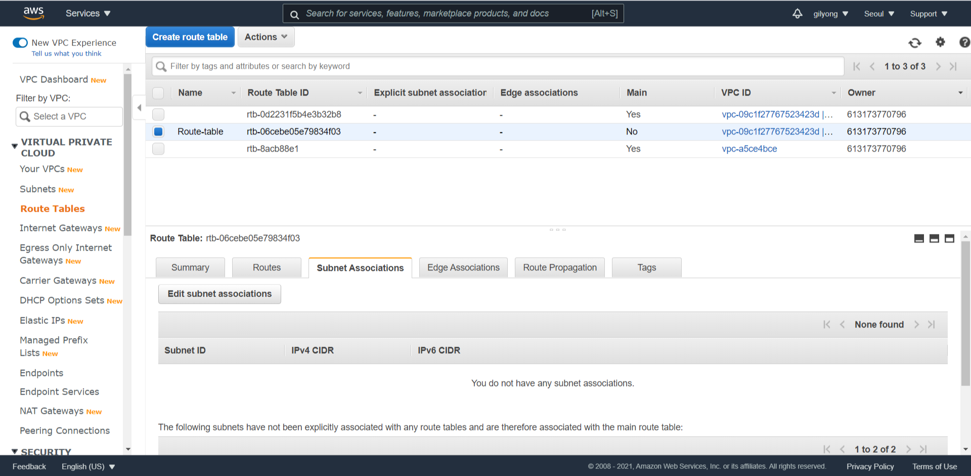 3. 라우팅 테이블이 생성되었다. 서브넷에 연결하려면 Subnet Associations > Edit subnet associations 눌러서 서브넷을 연결해주자.