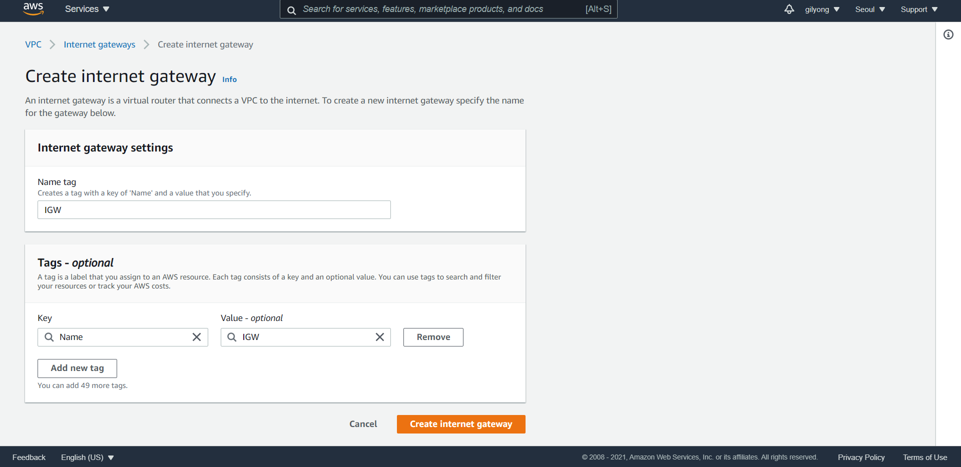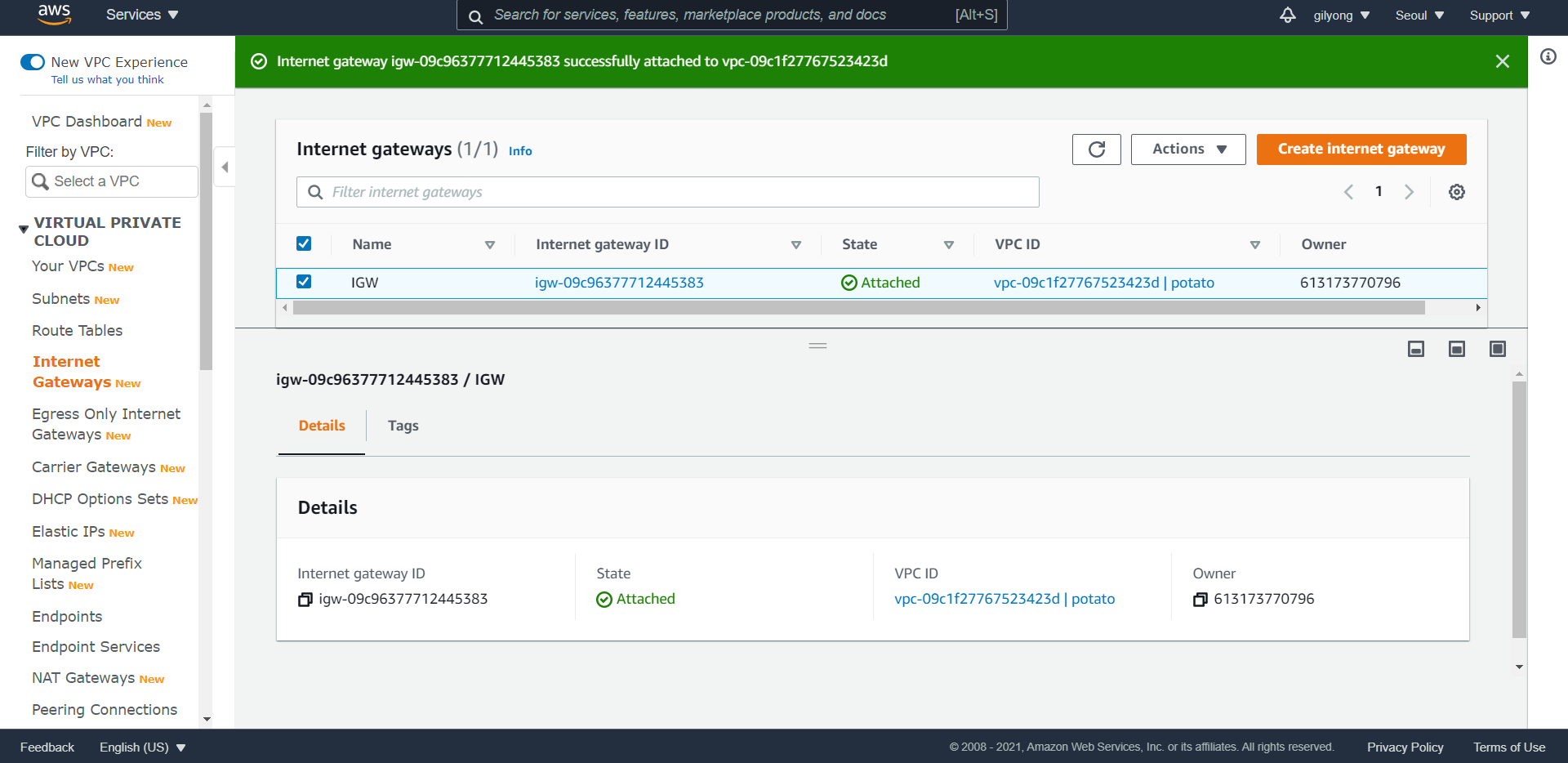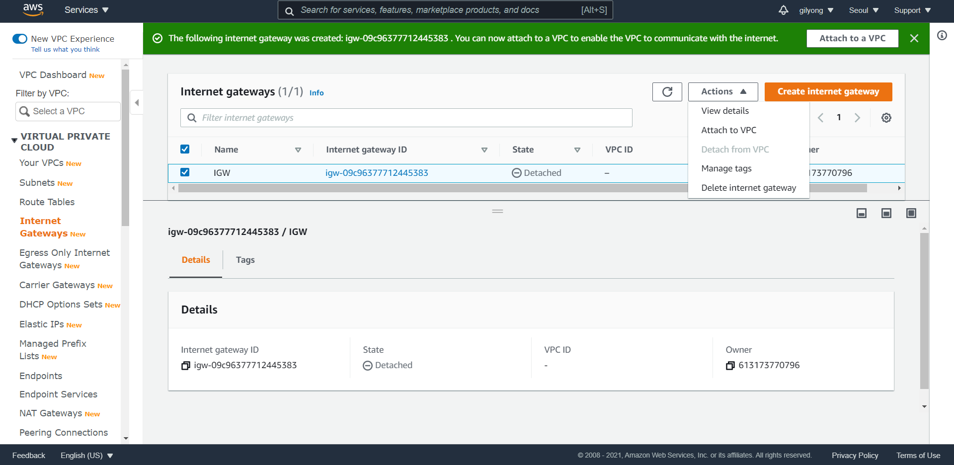 인터넷과 통신을 가능하게 해주는 인터넷 게이트웨이를 생성해보자