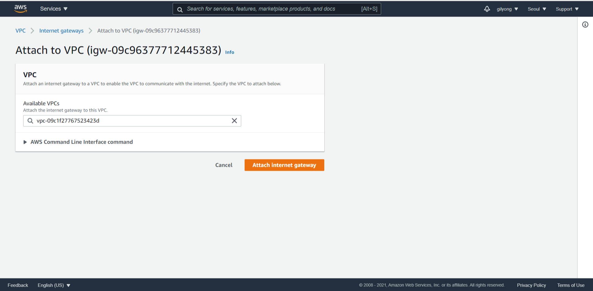 4. 인터넷 게이트웨이를 연결할 VPC를 선택해준다.