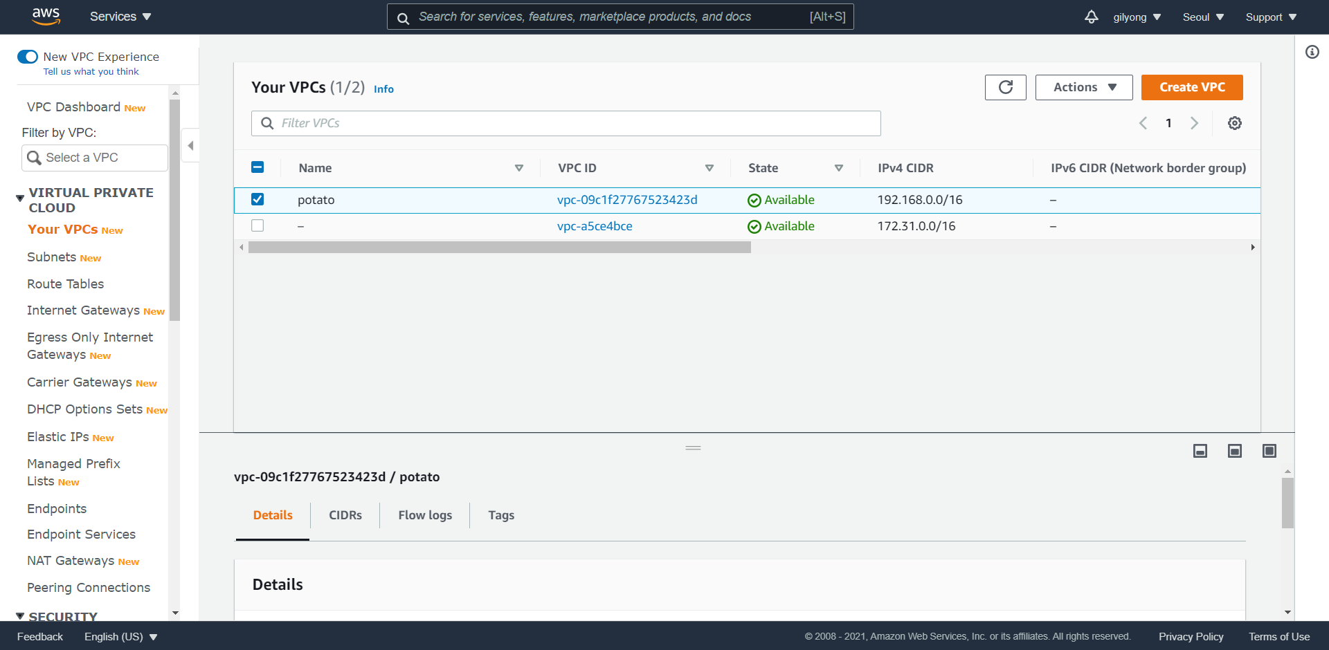 3. 192.168.0.0/16 대역의 potato라는 VPC가 생성되었다.