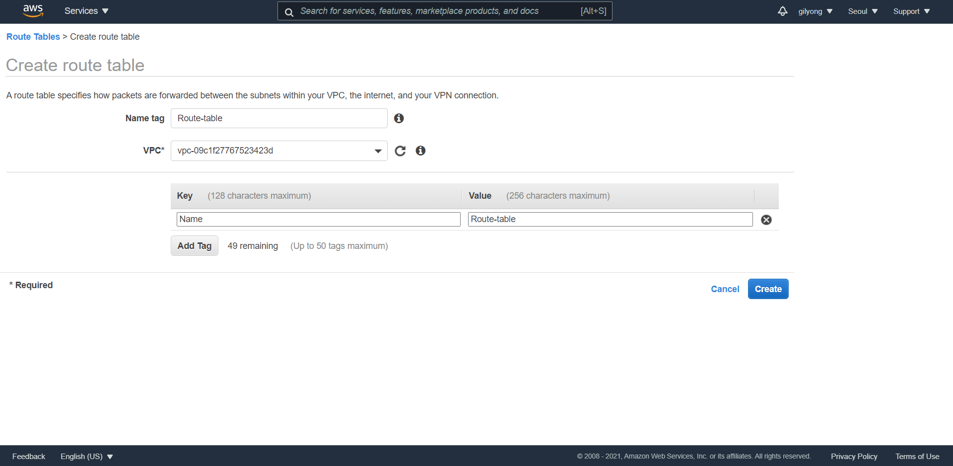 1. Route Tables 항목에서 'Create route table'을 클릭해 라우팅 테이블을 생성해주자.