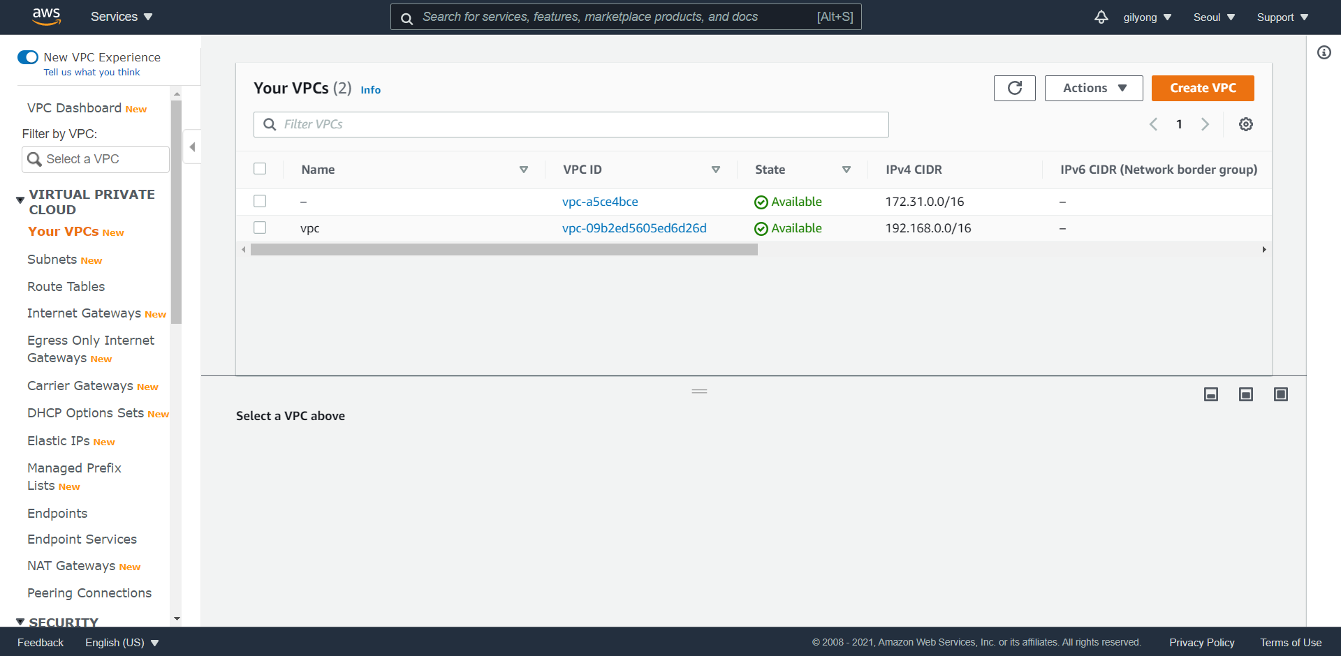 1. AWS Console에서 VPC를 찾아 들어가주고, 'Create VPC'를 클릭해 VPC를 생성해주자.