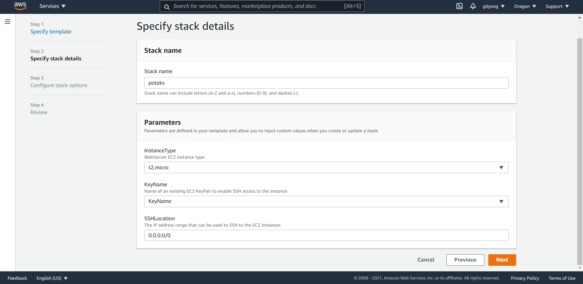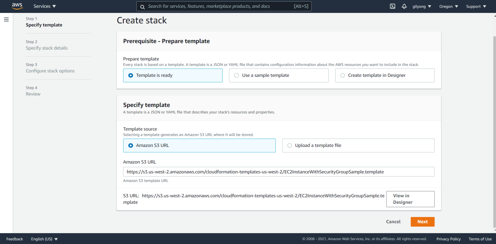 2. AWS에서 기본으로 제공하는 템플릿 URL을 입력해주었다.