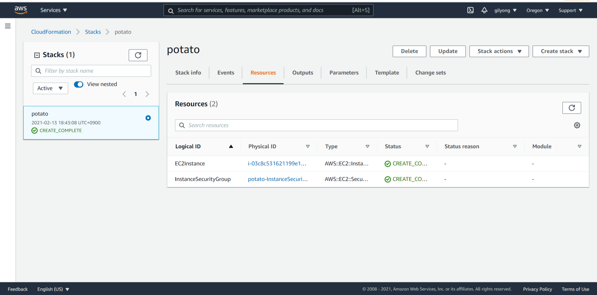 이렇게 CloudFormation 템플릿을 바탕으로 VPC,EC2 인스턴스 등을 구축하여 생성한 것을 CloudForamtion Stack이라고 한다.