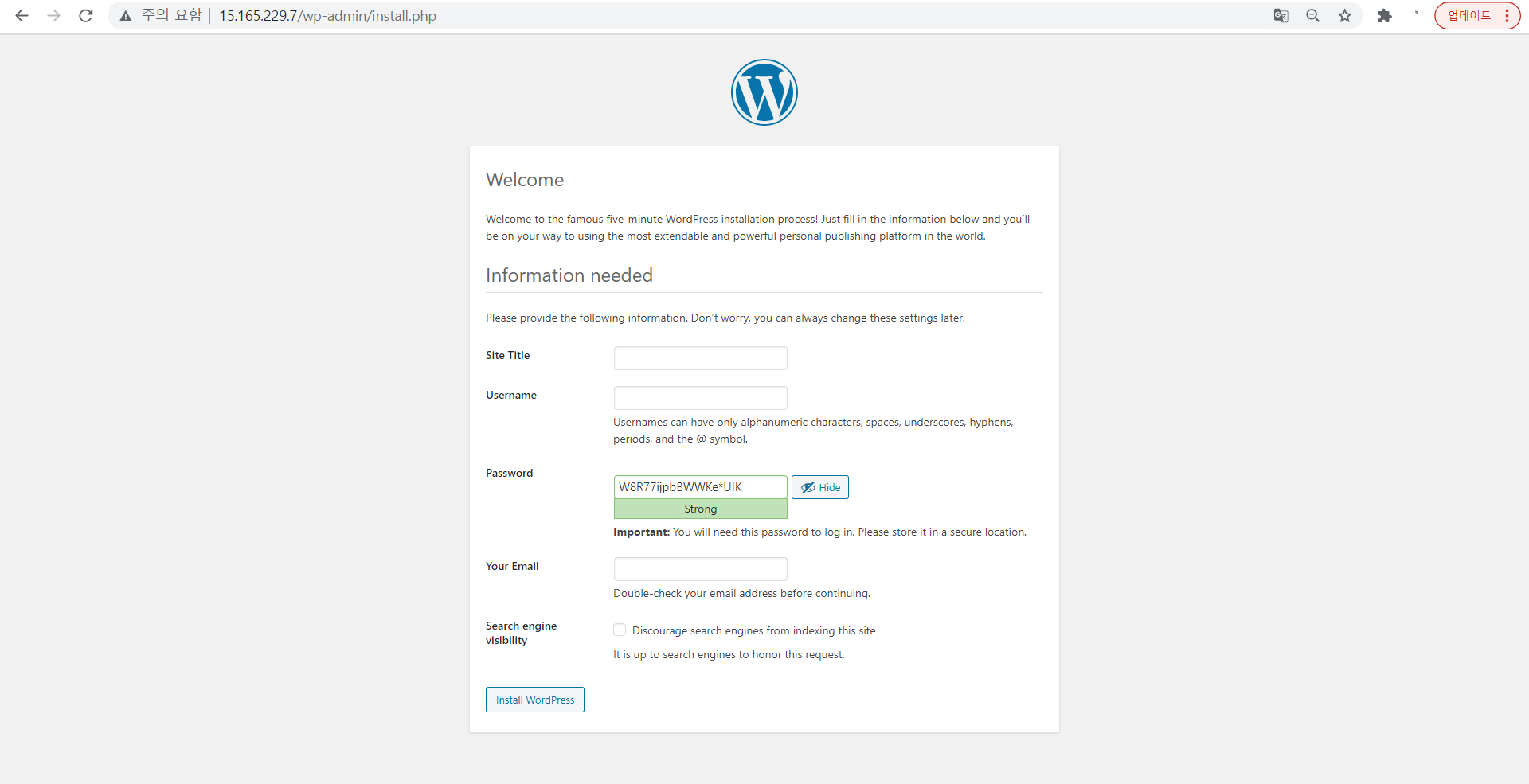 1. 이제 EC2 인스턴스의 Public ip 주소를 통해 접속하게 되면, 다음과 같은 wordpress 화면을 볼 수 있다.