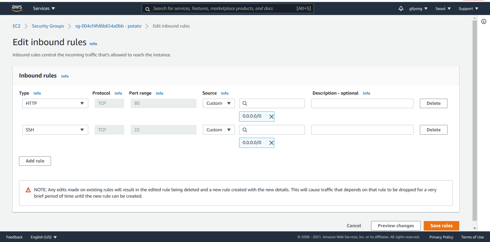 4. HTTP를 통해 Web에 접근하기 위해서 Security Groups에서 인바운드 규칙 HTTP 80번 포트를 허용해주자.