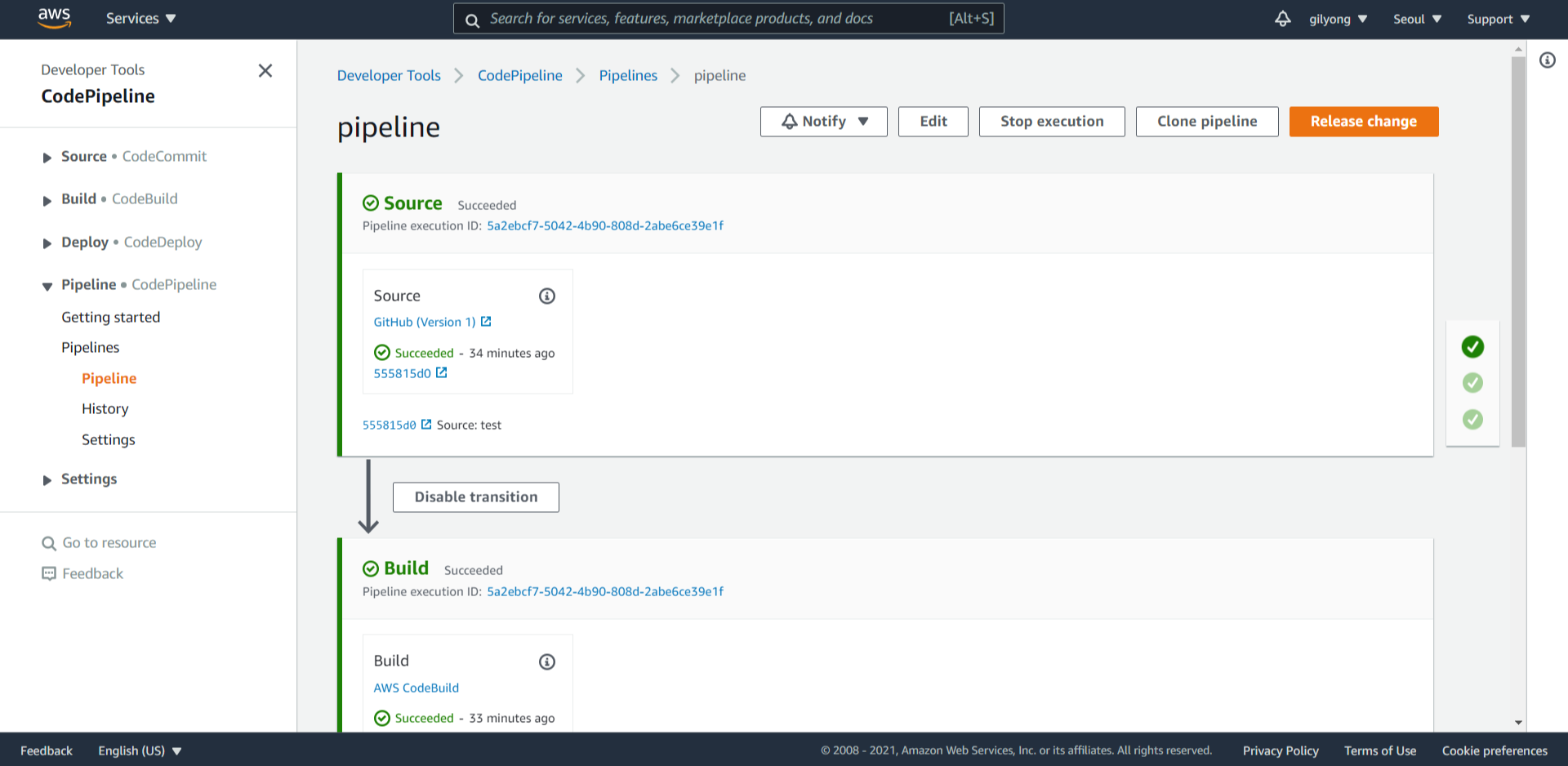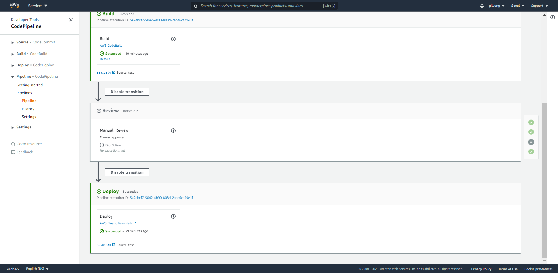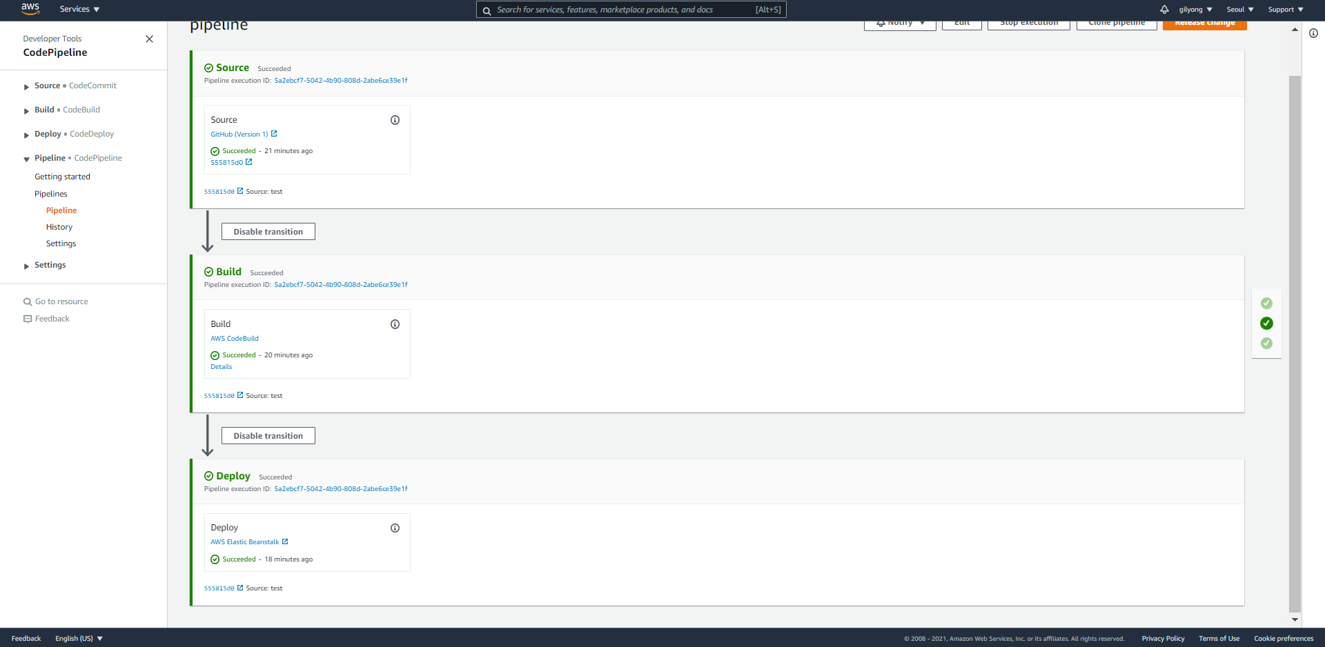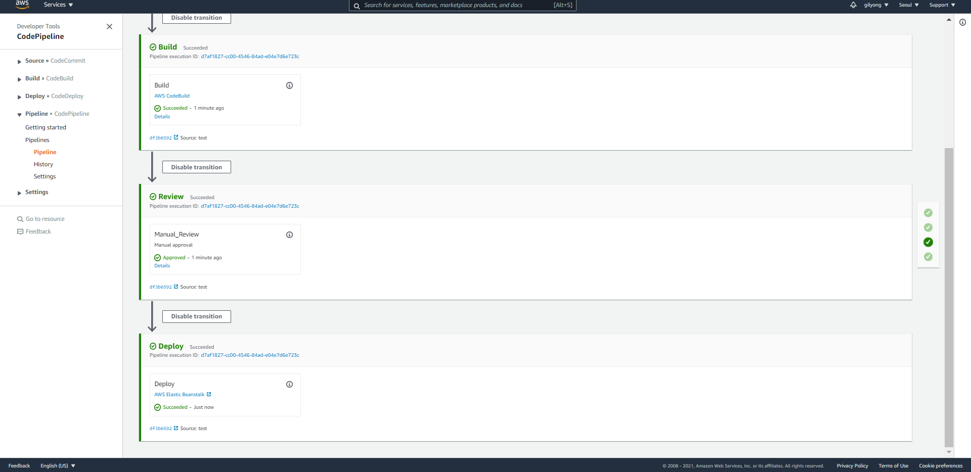 8. 이제 등록한 Git 레포지토리에서 새로운 내용이 Push될 때마다 이 AWS CodePipeline은 자동으로 CodeBuild를 통해 소스코드를 빌드하고 관리자가 수동으로 승인해주면 Elastci Beanstalk의 등록된 애플리케이션이 자동으로 배포되는 하나의 과정으로 진행된다.