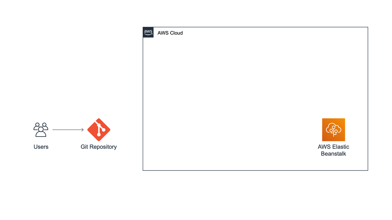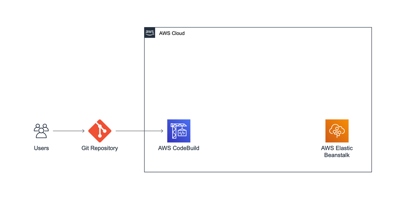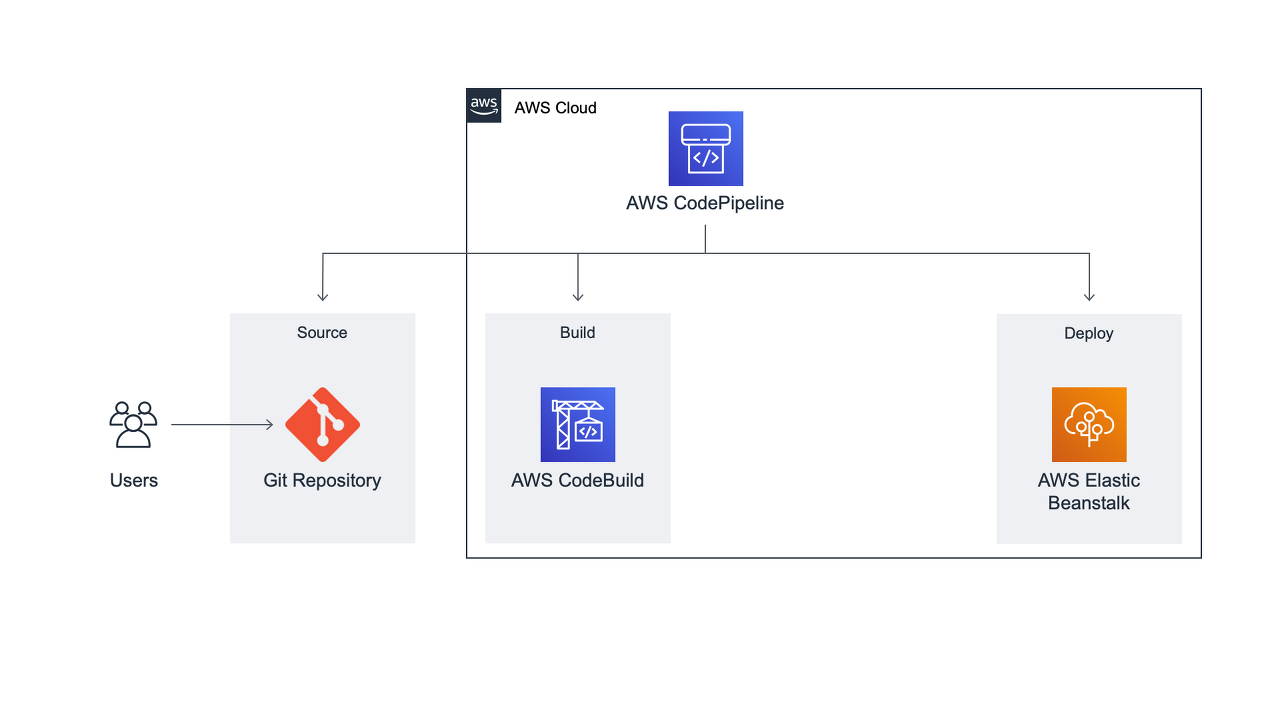 아래의 다이어그램은 이 자습서에서 사용되는 서비스와 그 연결 방식을 시각적으로 보여줍니다. 이 애플리케이션은 아래 그림과 같이 GitHub, AWS Elastic Beanstalk, AWS CodeBuild 및 AWS CodePipeline을 사용
