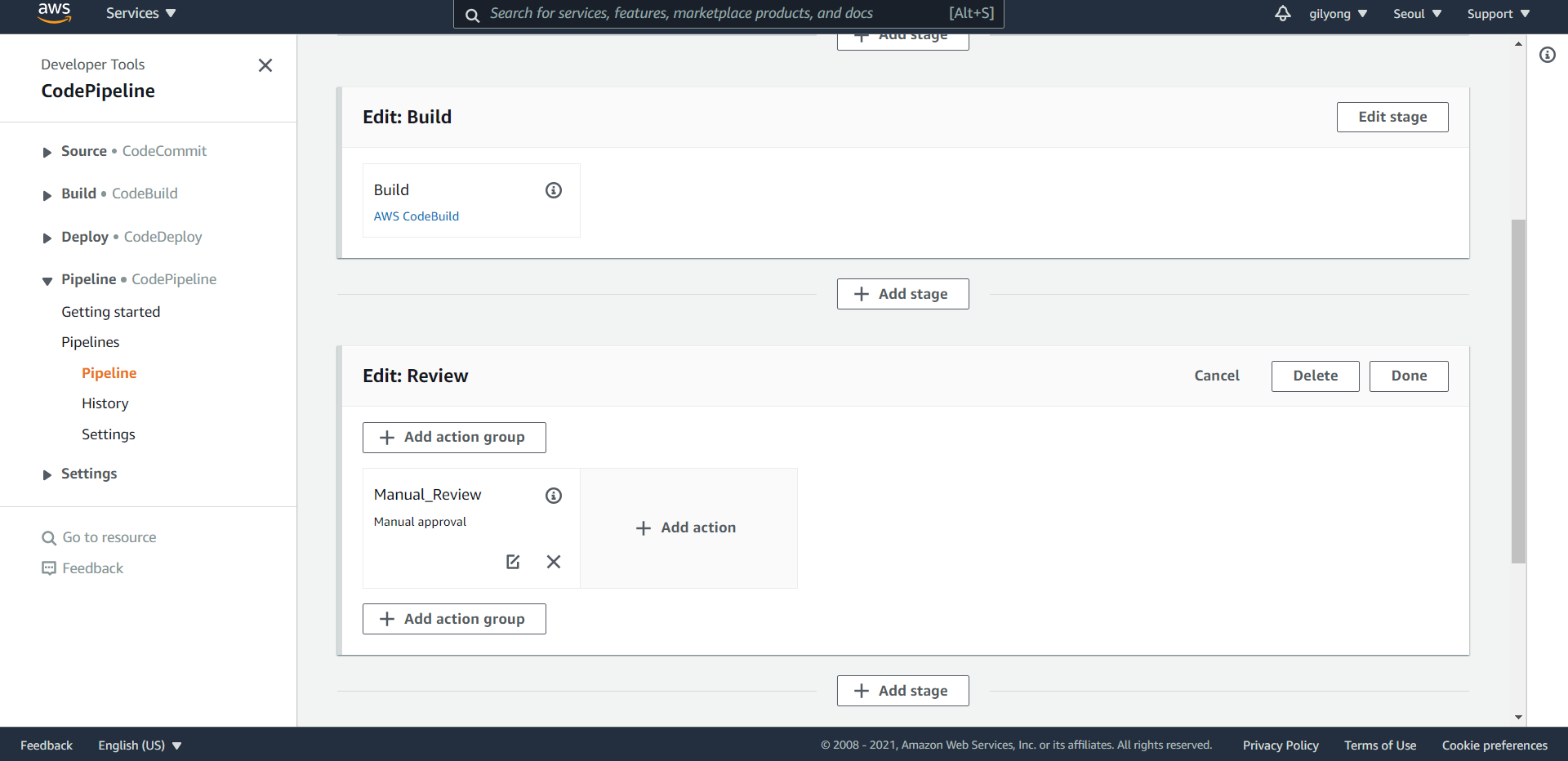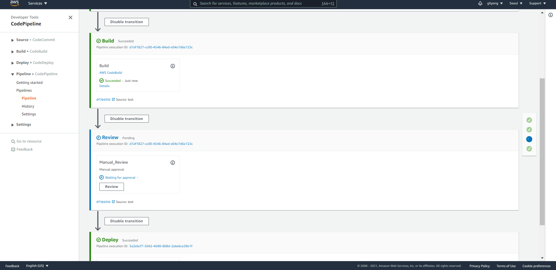 마지막 실습 단계에서는 파이프라인에 Manual Approval 단계를 추가해 애플리케이션이 배포되기 전에 수동으로 관리자가 승인하는 과정을 추가해보았다. 작업이 승인 거부되거나 7일 동안 승인요청을 받지않으면 파이프라인 실행이 취소된다.