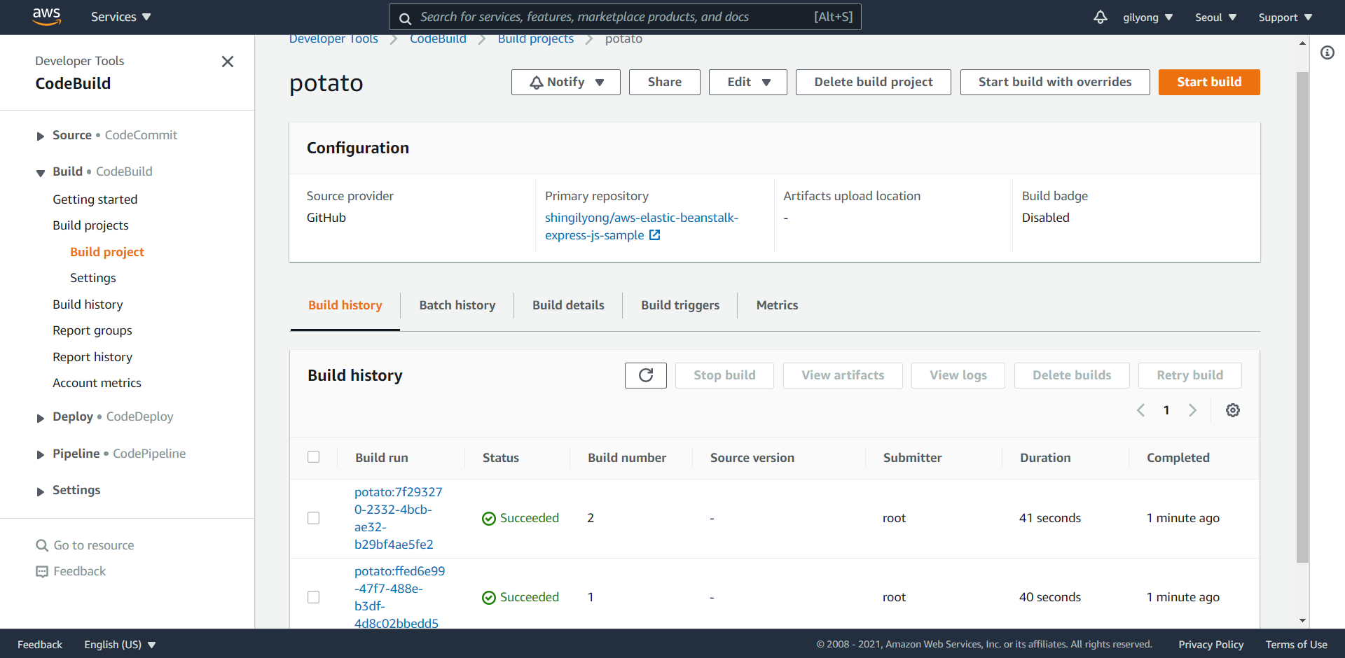 이제 Git 레포지토리에서 받아온 소스 코드를 CodeBuild를 통해 빌드할 수 있습니다.