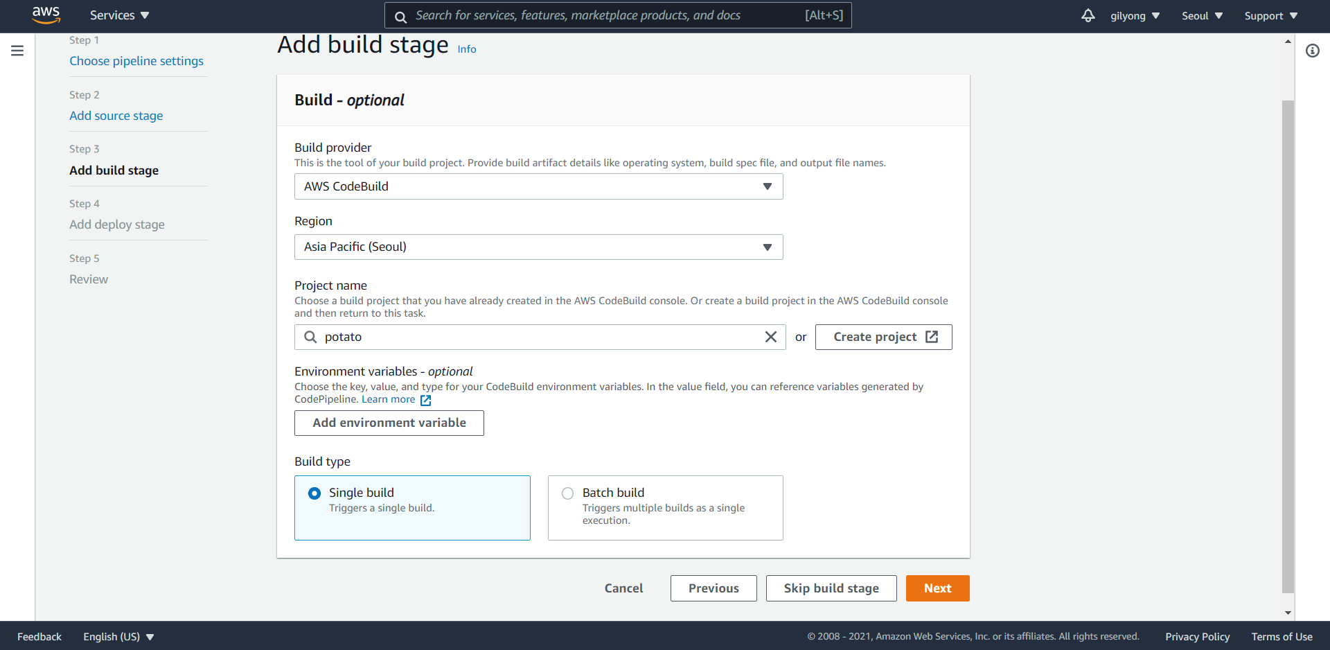3. pipeline에서 사용할 CodeBuild 프로젝트를 선택해주자