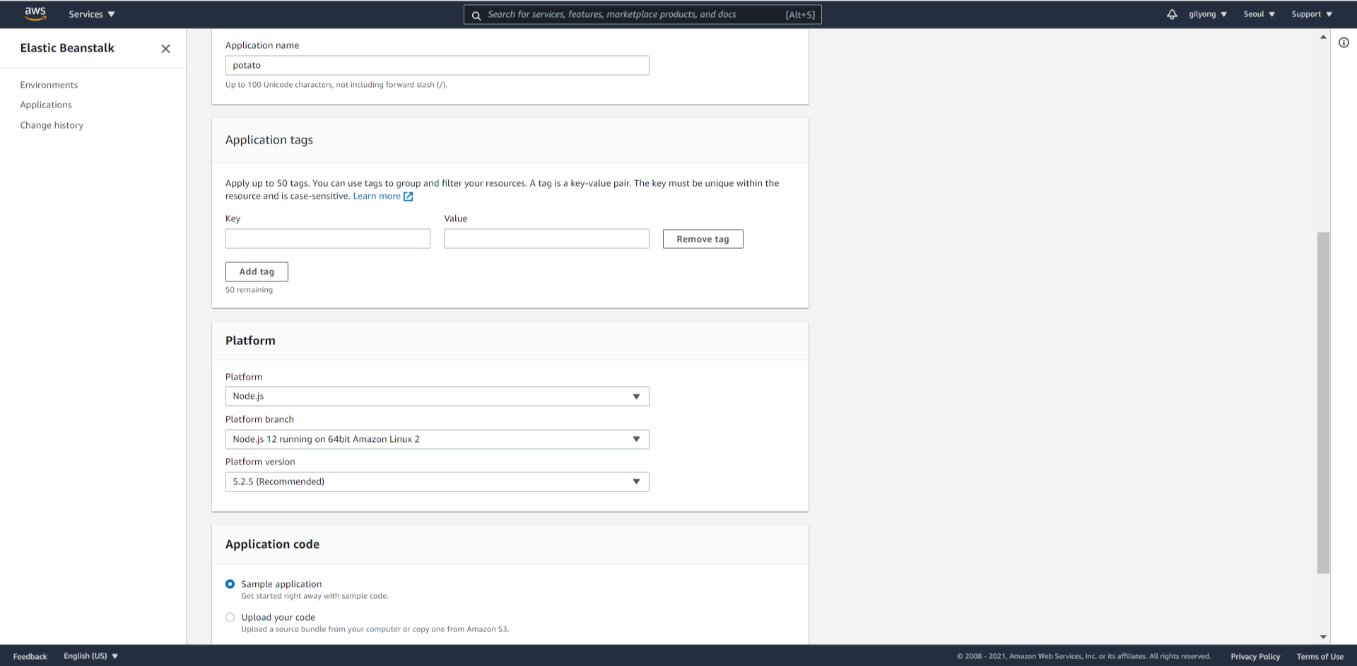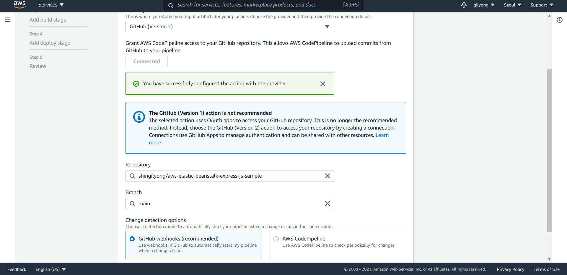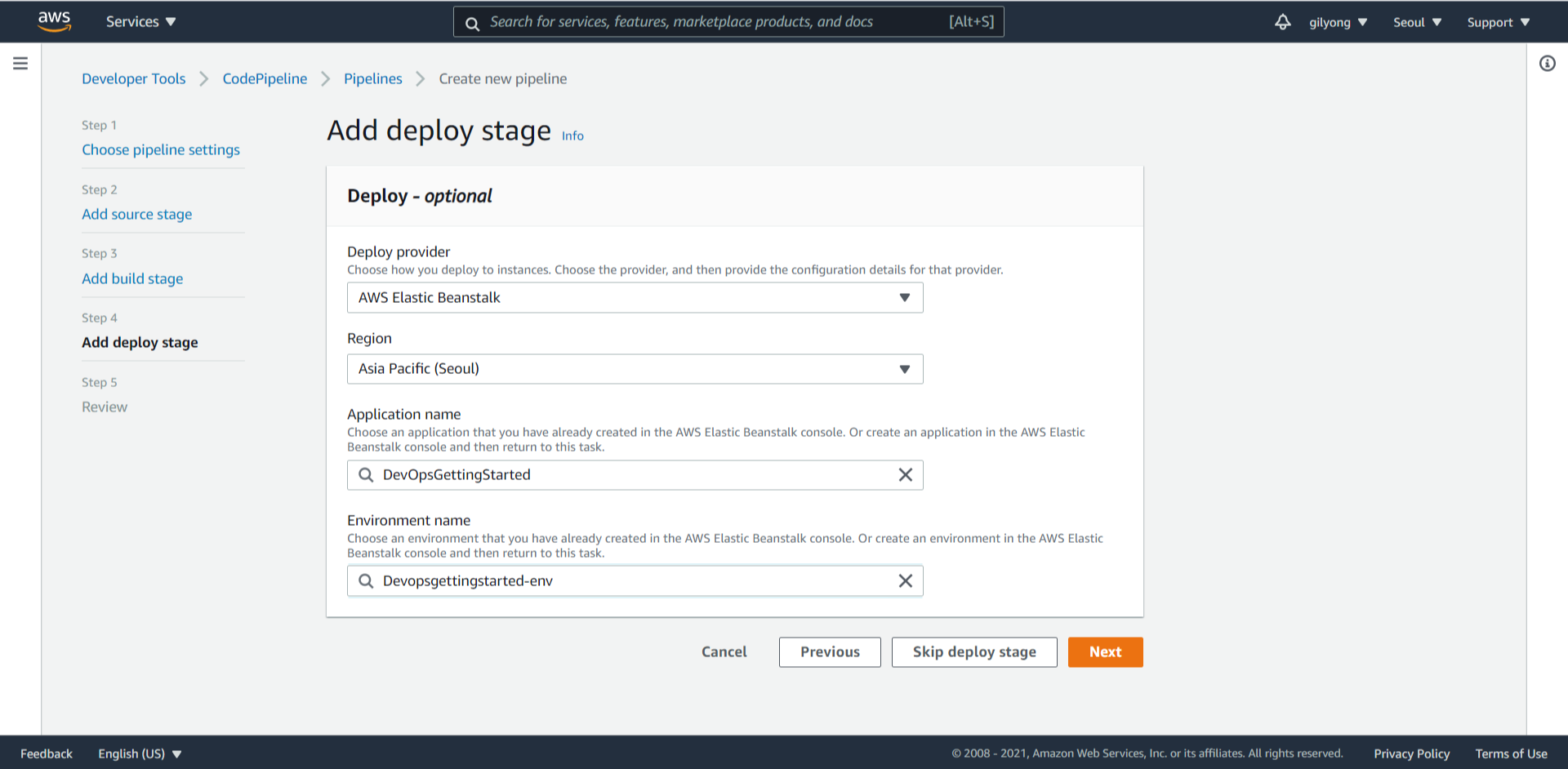 3. pipeline에서 사용할 Elastic Beanstalk에서 배포한 애플리케이션을 선택해주자