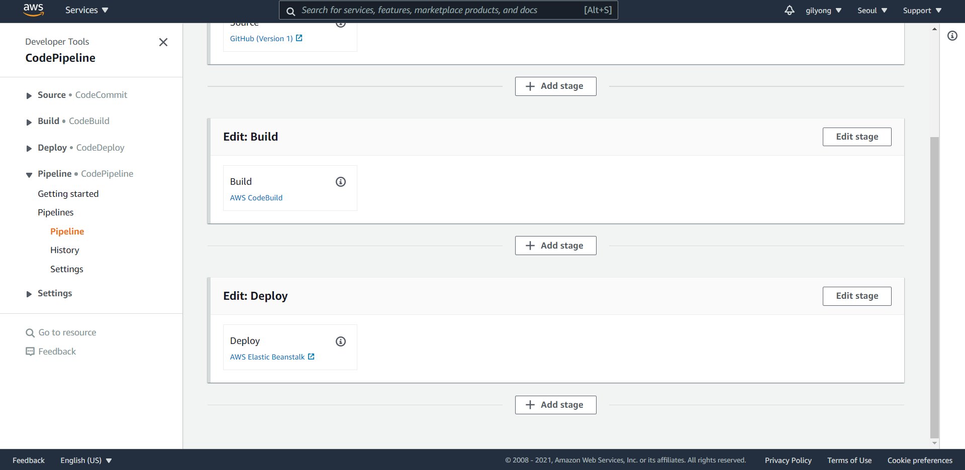 이번 실습에서 Pipeline의 역할은 Git에서 소스를 받아와서 CodeBuild에서 빌드시키고 Elastic Beanstalk에서 배포시키도록 워크플로우를 구성합니다.
