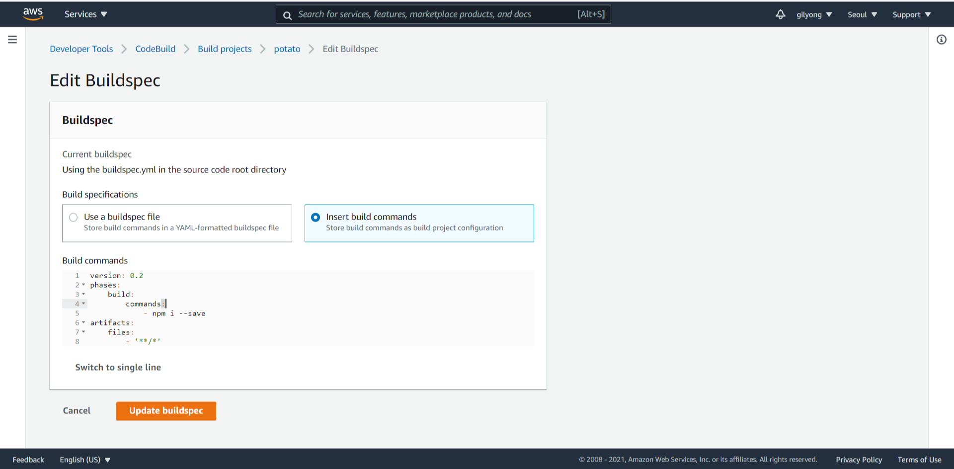 4. 생성한 프로젝트에 Edit > Buildspec 을 눌러서 Buildspec파일을 생성해줍니다.
