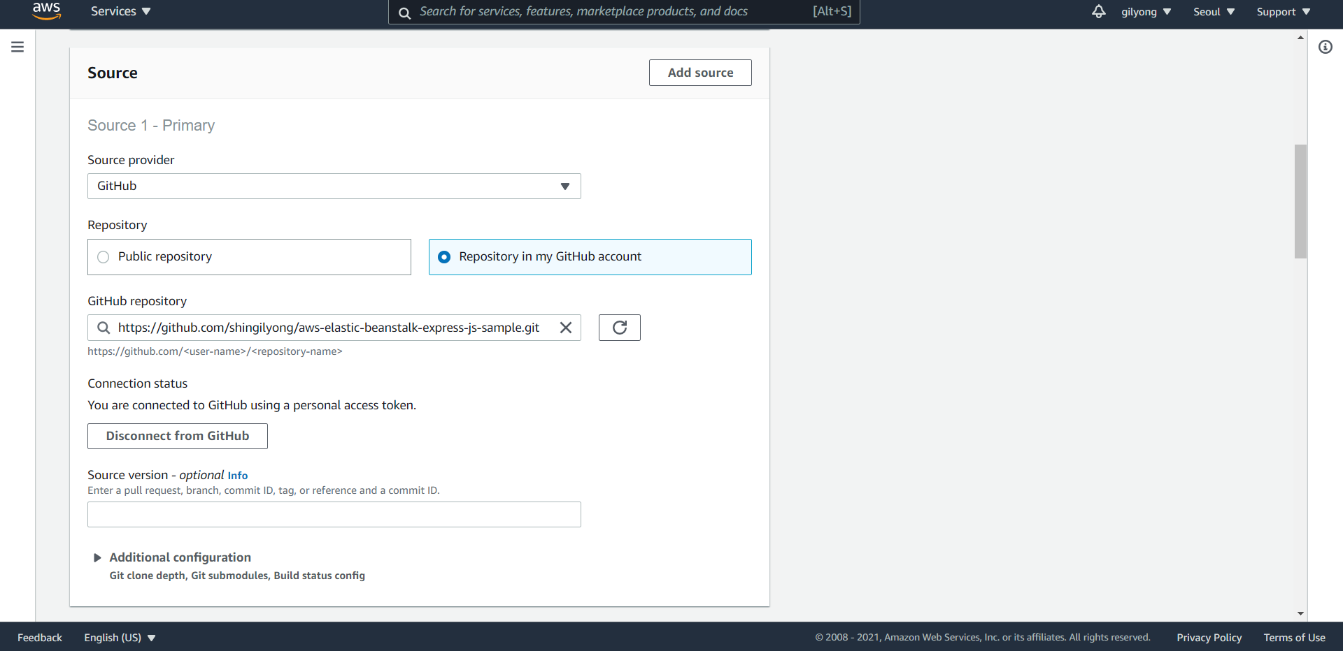 2. Source를 Github로 선택해주고 내 깃허브 레포지토리 사용해주자.